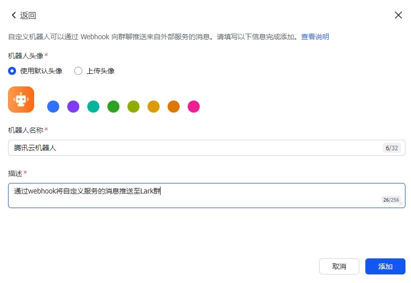 5. 添加机器人头像、机器人名称和描述后,单击右下角的添加。