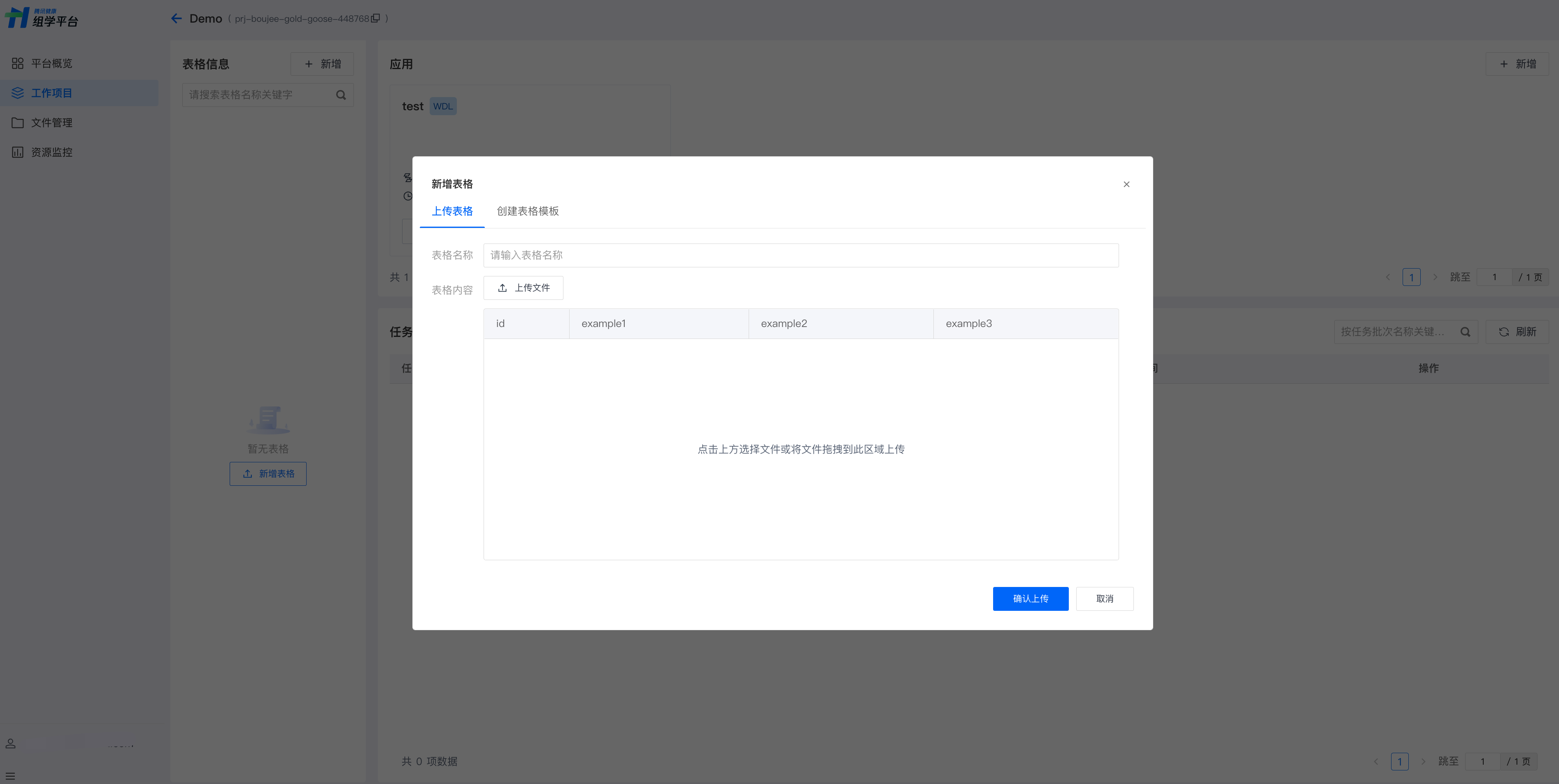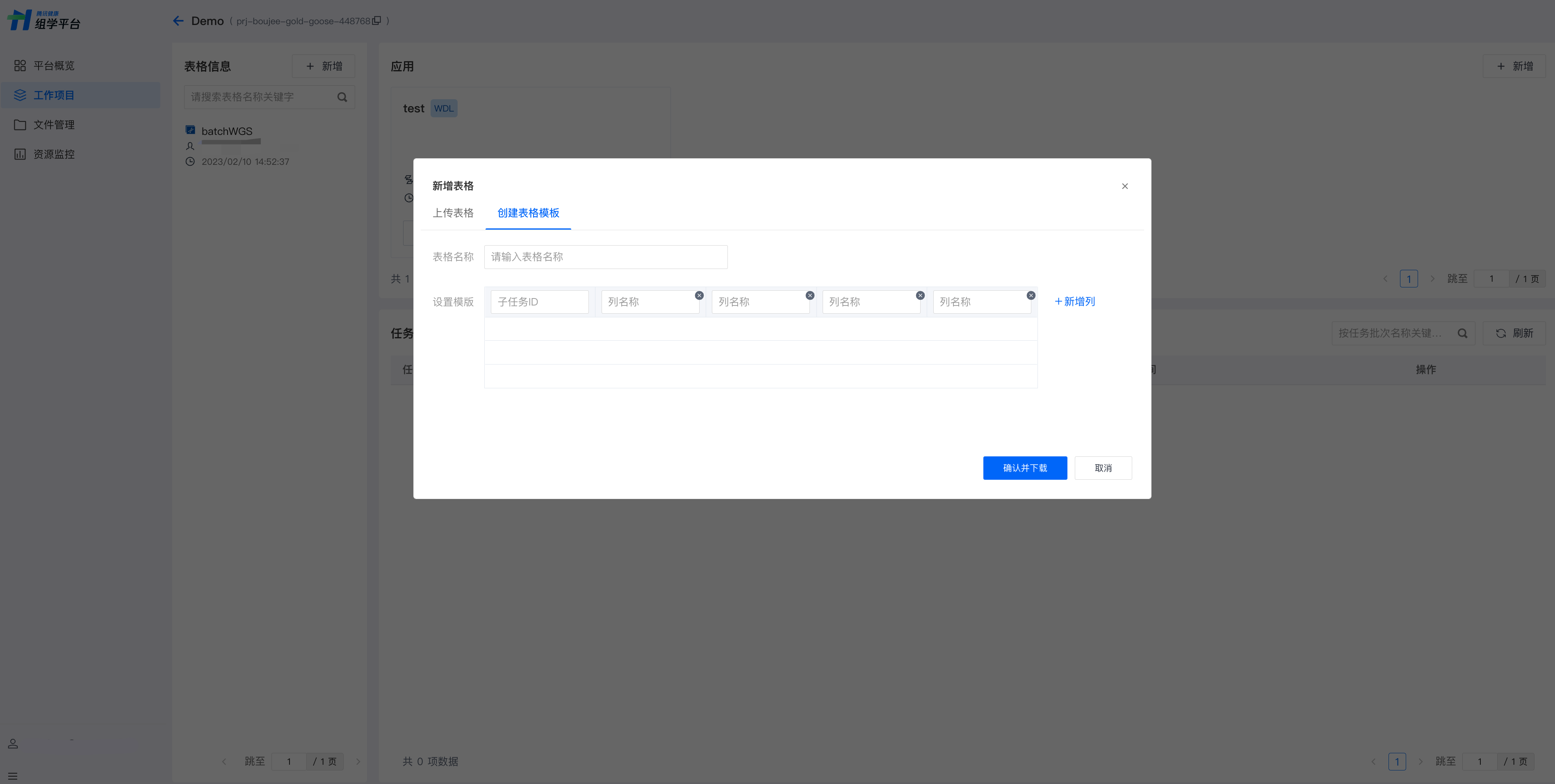 用户可以在平台上创建自定义模板并下载至本地。在选定工作项目页面,选择表格信息栏的新增,选择创建模板,输入表格名称、列名称、子任务 ID 等必要信息后,单击确认并下载,即可得到 csv 格式的自定义模板。