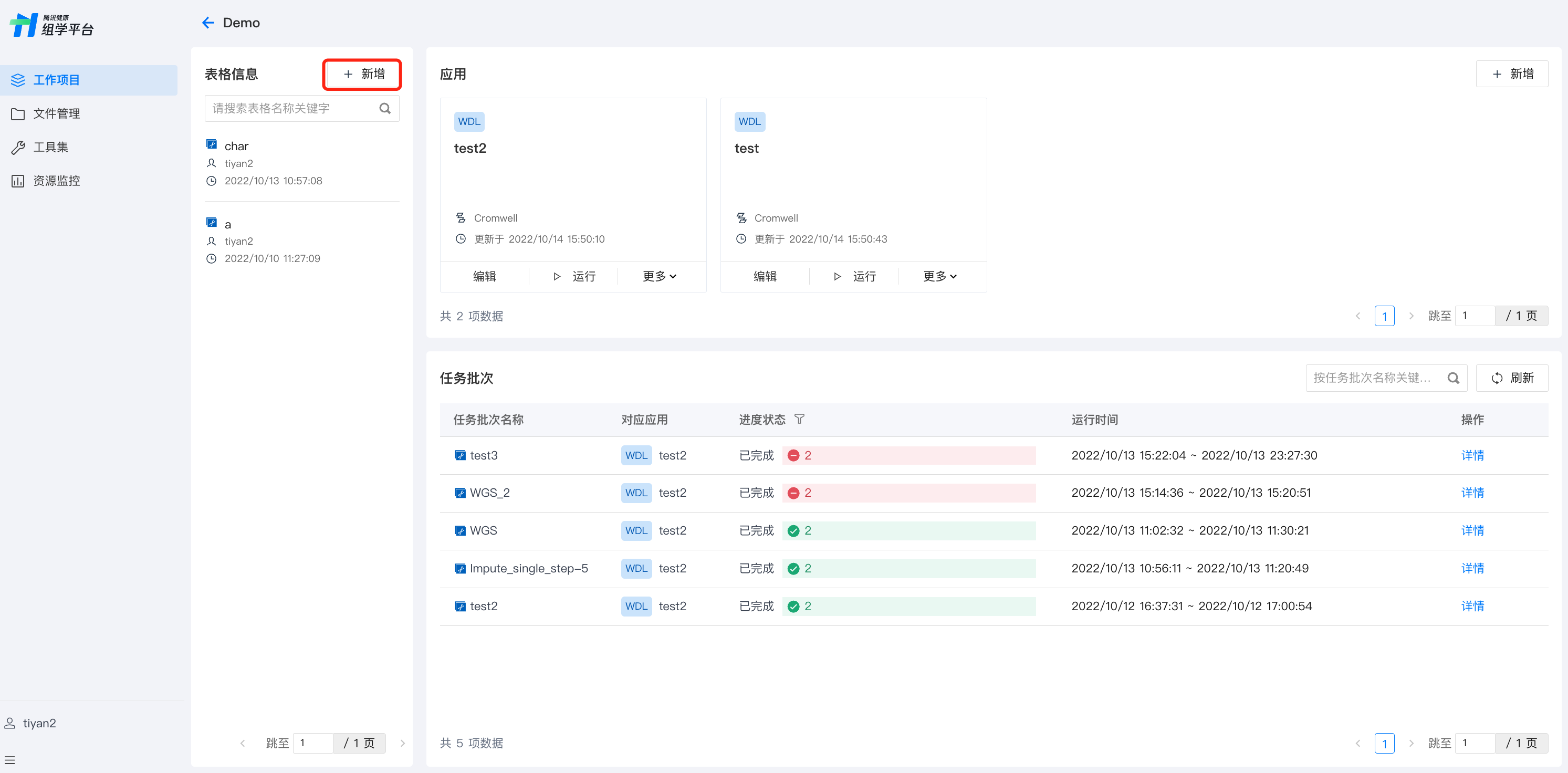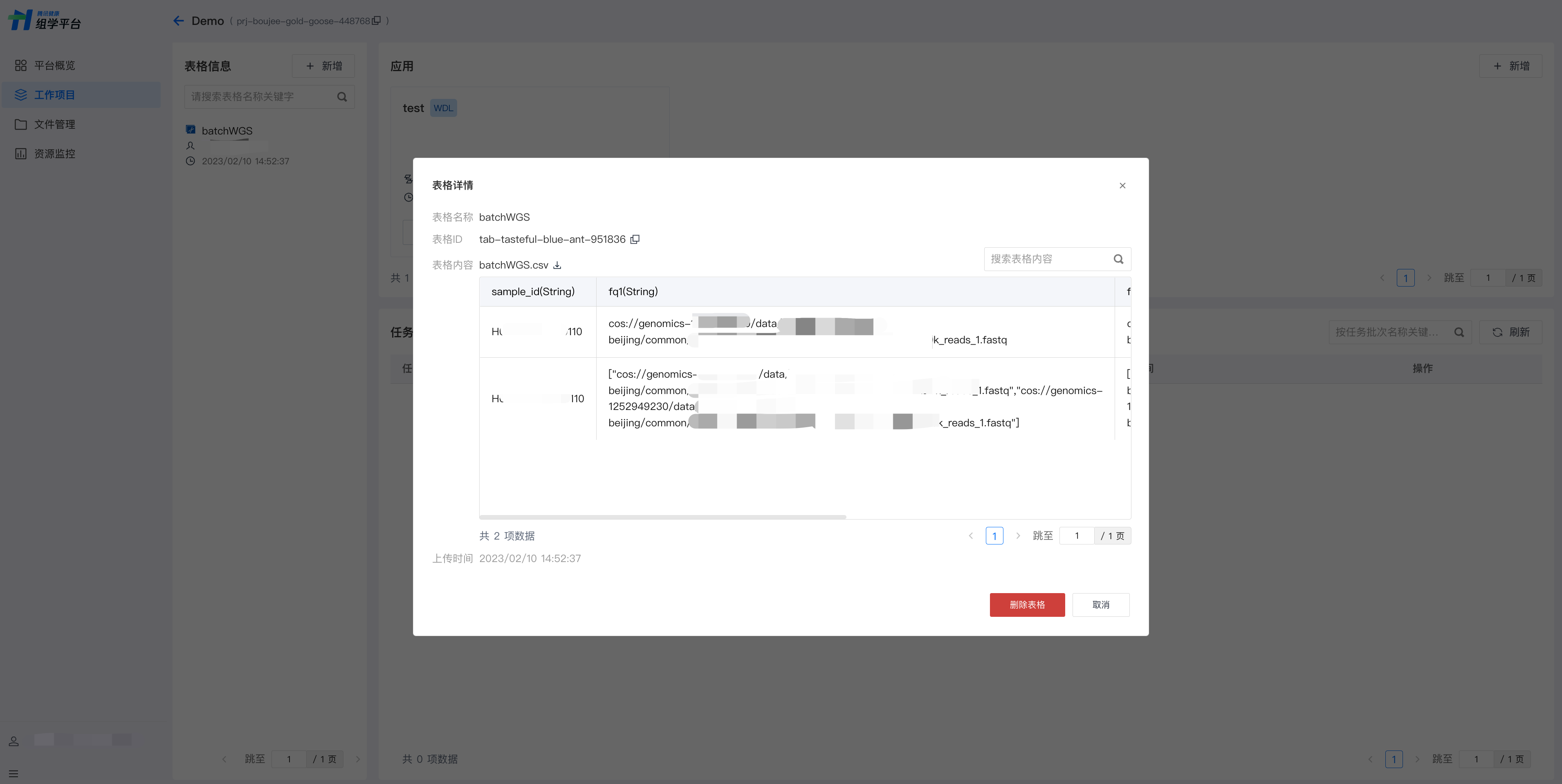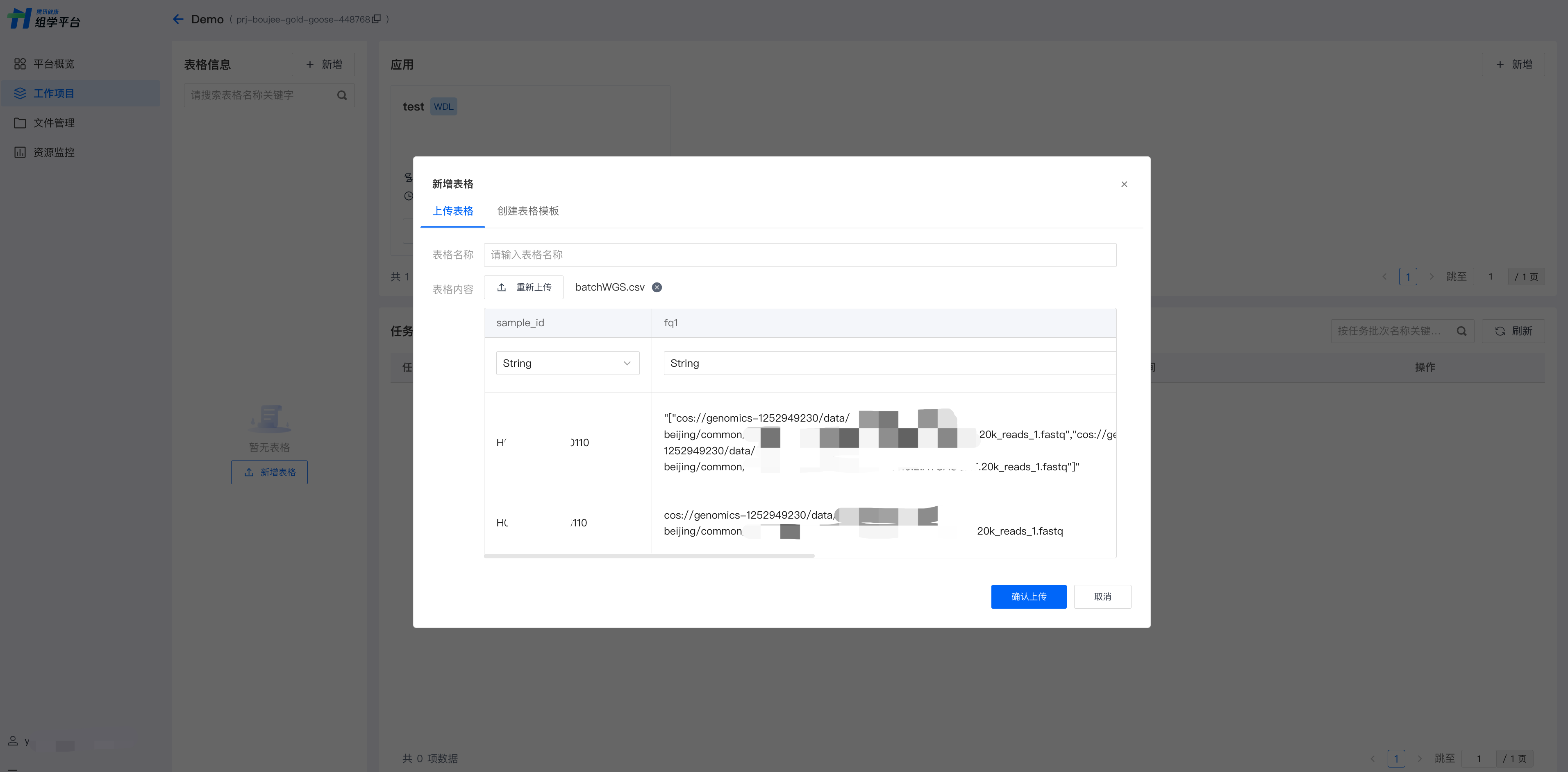 在组学平台,以表格形式进行处理数据,每一行数据代表一个子任务。表格适用于输入文件不同,整体流程相同的情况下批量投递任务。