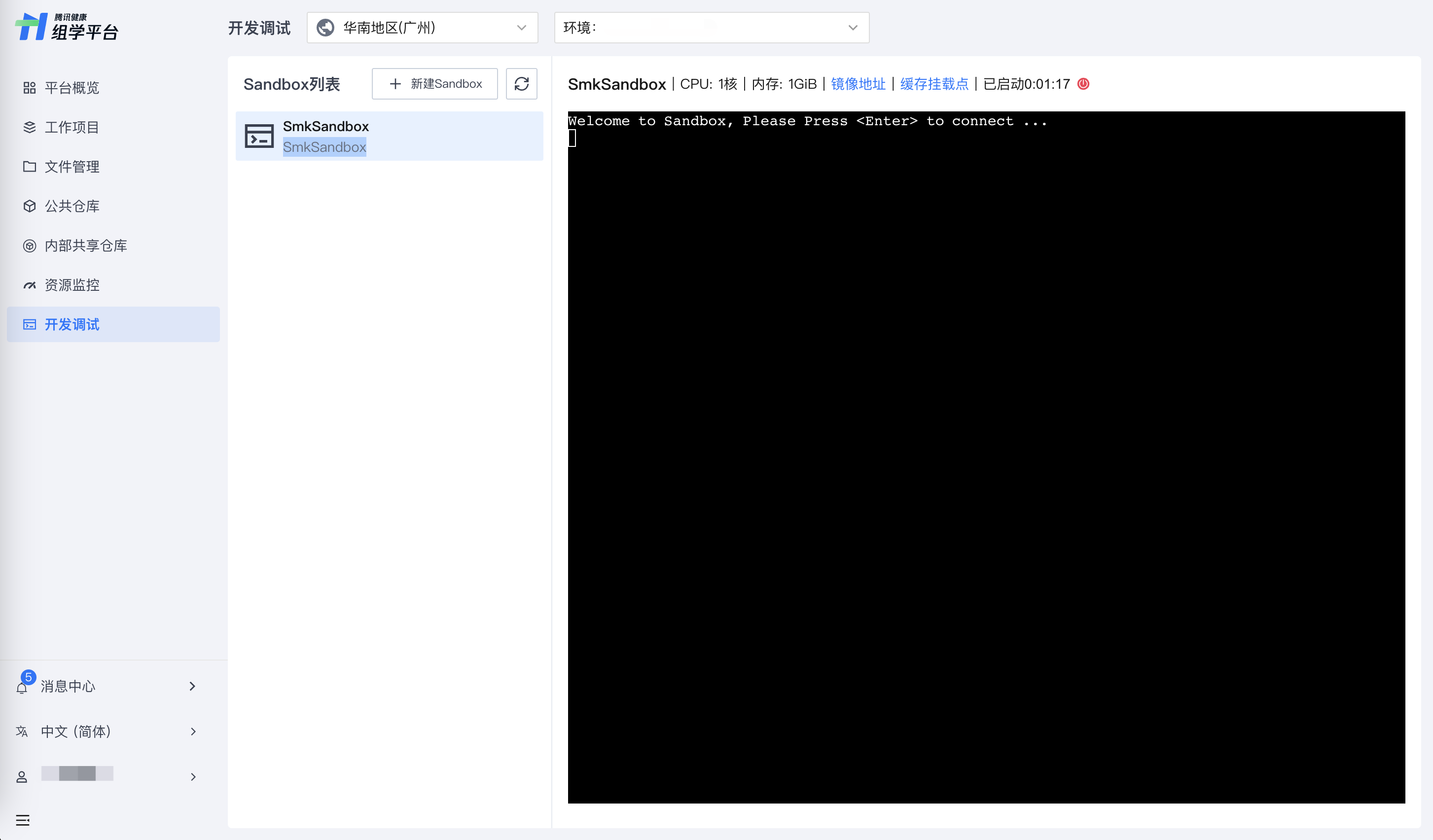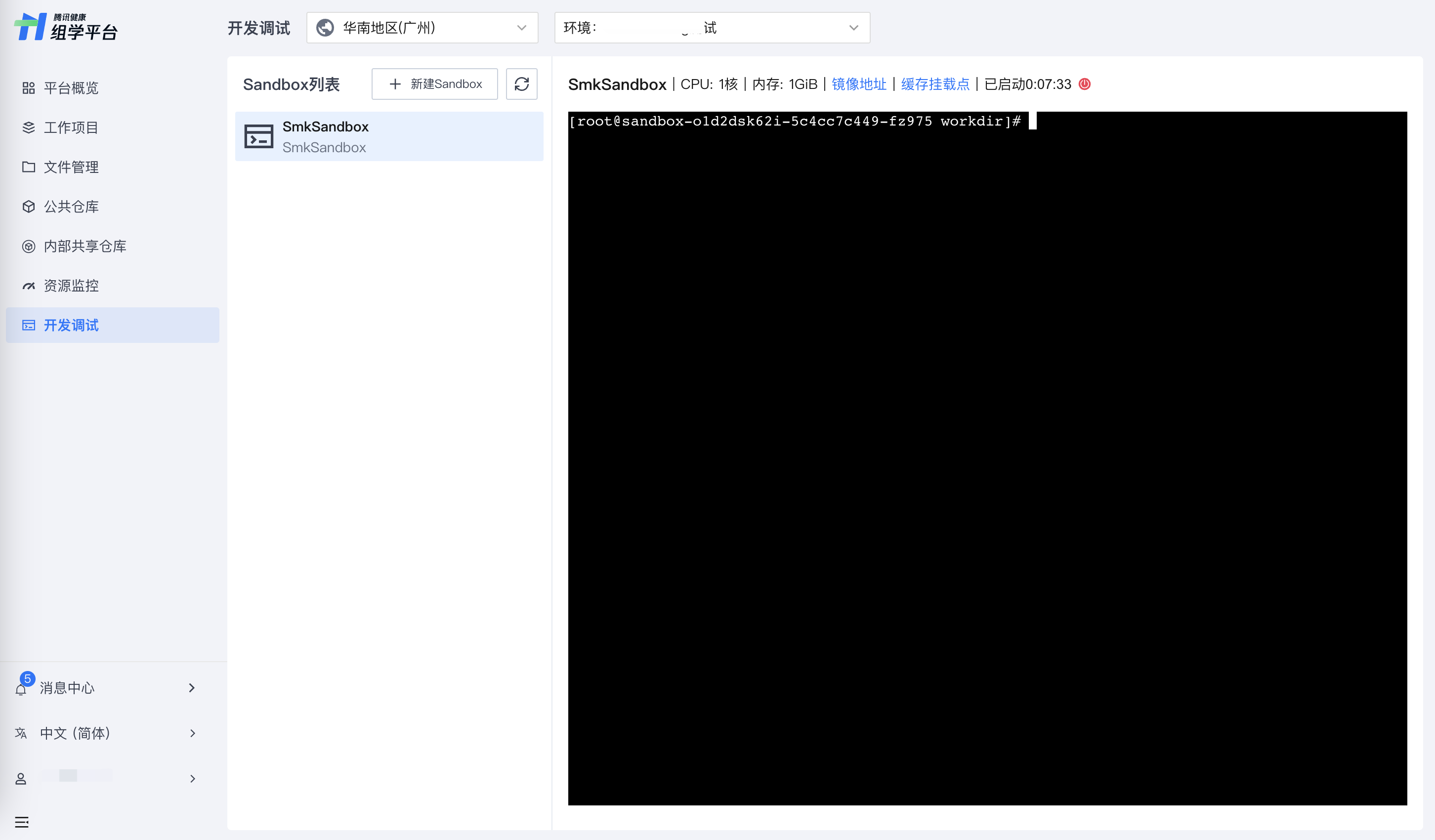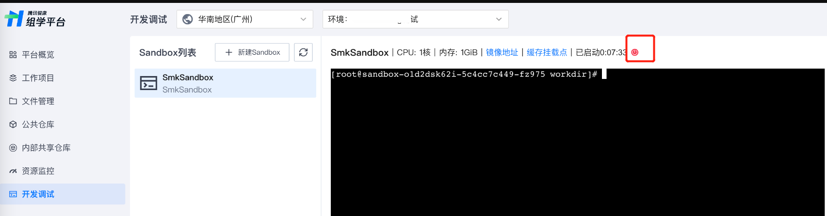 腾讯健康组学平台提供开发调试模块,用于在生信分析流程的开发和调试阶段,给用户验证流程的可行性。当前开发调试模块的关键功能是沙箱功能(以下称Sandbox),Sandbox 提供一个封闭的沙箱运行环境,并且提供多种镜像以及多种规格的 CPU 和内存,同时整合平台内的缓存数据卷功能用于挂载数据卷到Sandbox,用户在 Sandbox 中可以使用命令行进行操作,具有较高的灵活度。