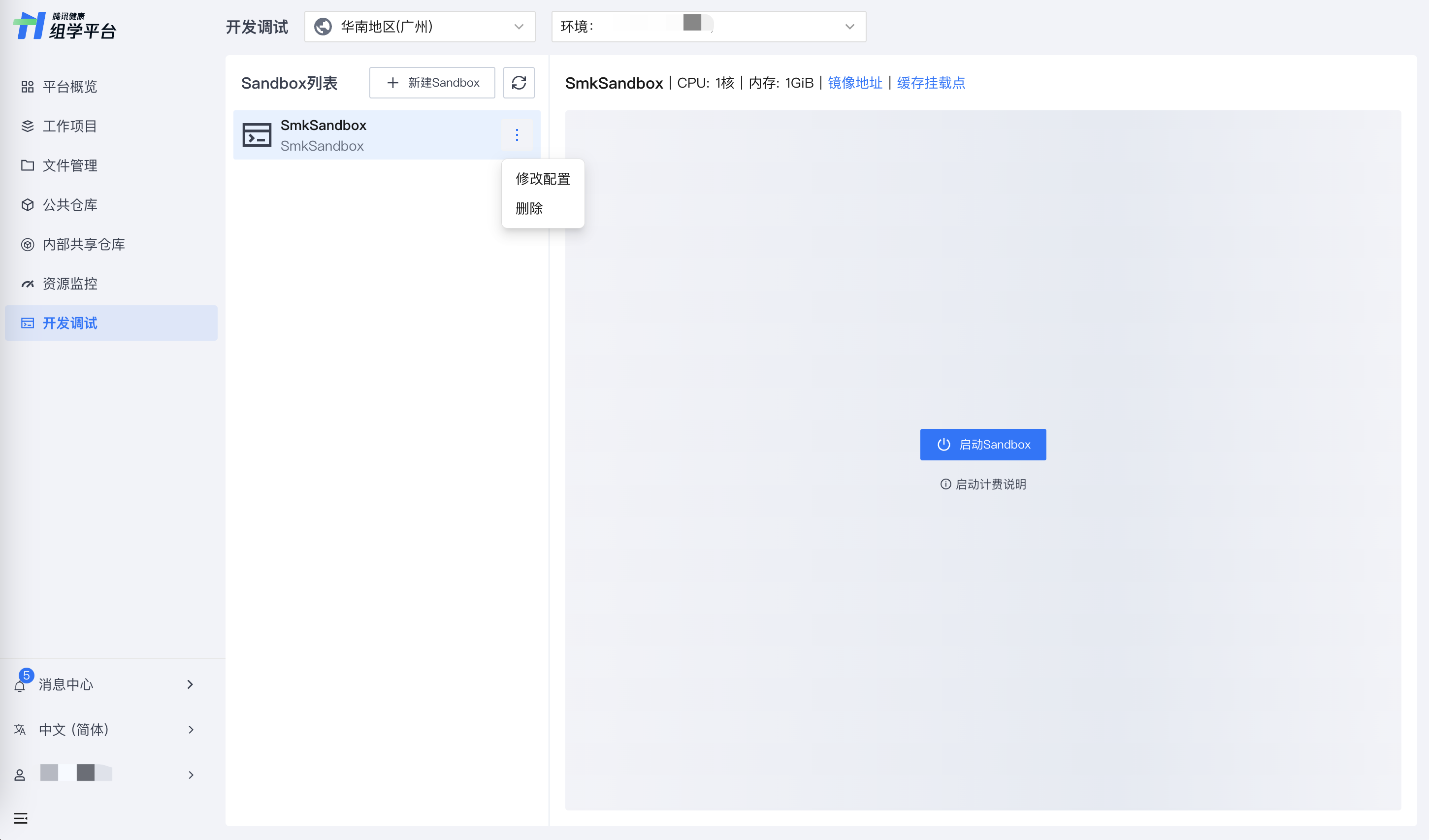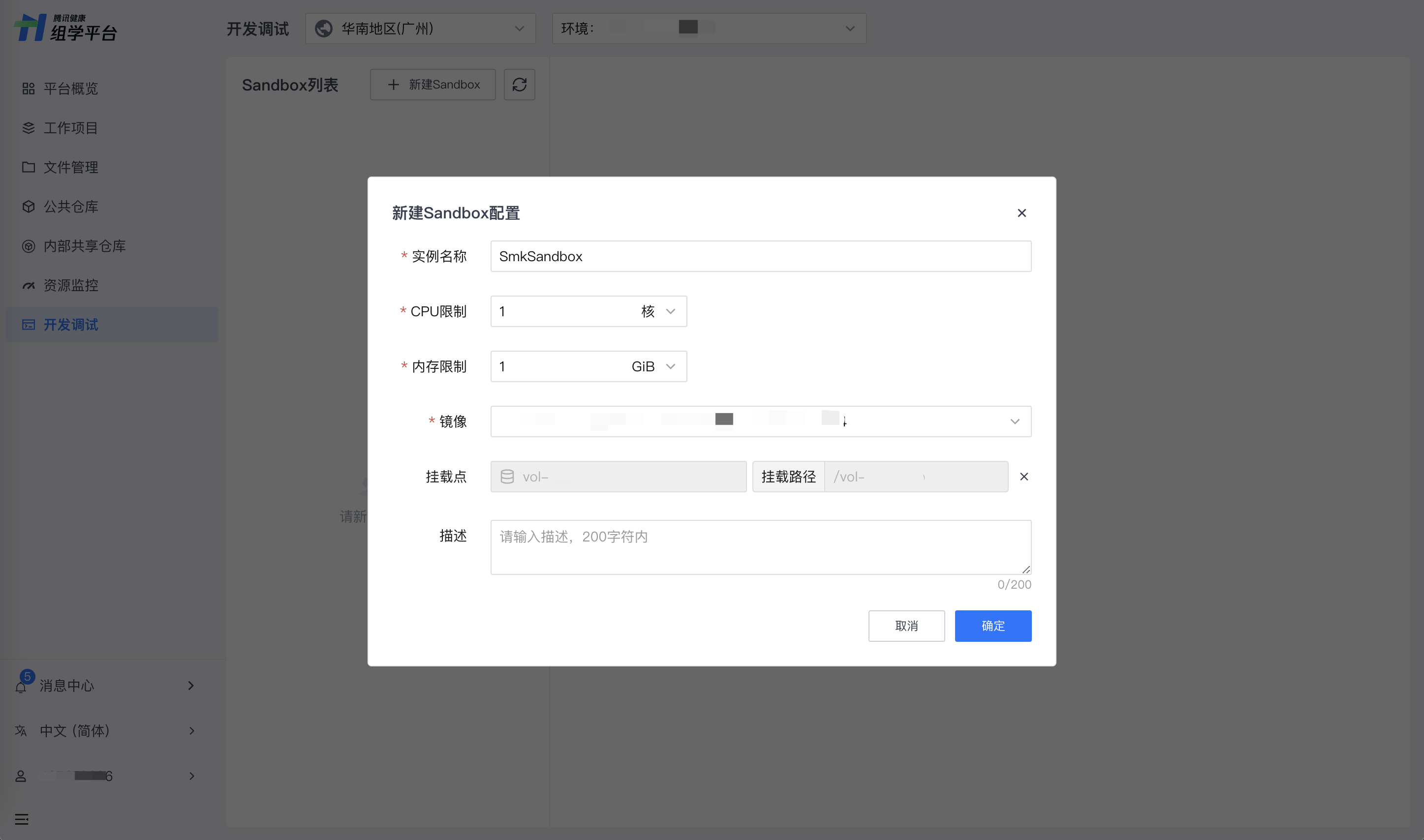 1. 进入 开发调试 模块,选择相应的地域以及环境(当前仅支持托管环境,创建步骤可参考 环境管理)。 2. 点击 Sandbox 列表中的新建 Sandbox,在表单中填写所需的 Sandbox 配置信息: