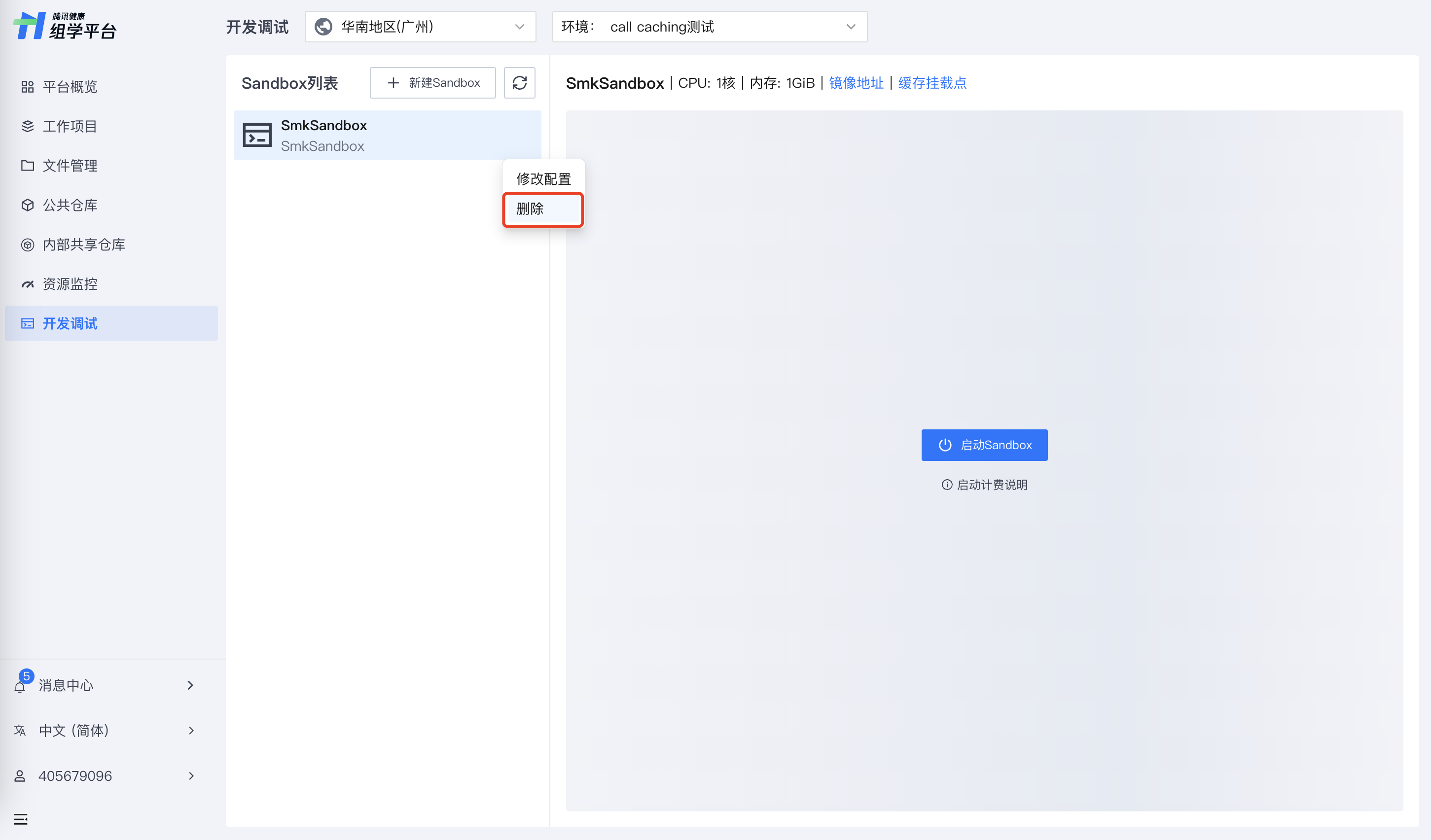 在 Sandbox 列表项中,选择需删除 Sandbox,点击删除。Sandbox 删除的同时将关闭 Sandbox。
