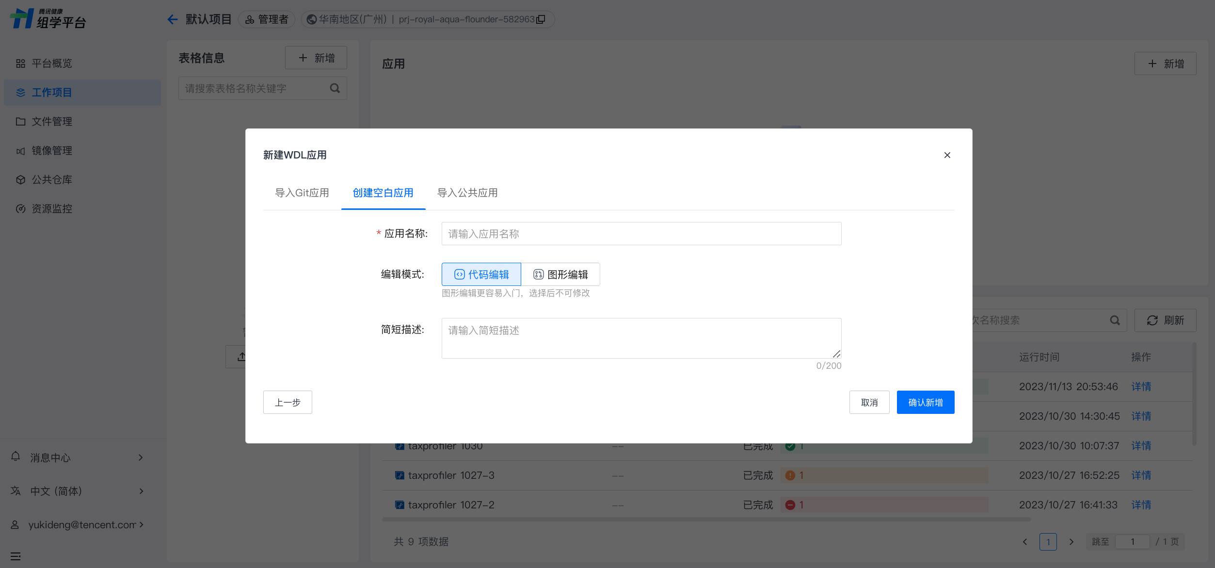 进入新建 WDL 流程,在新建应用弹窗内,选择创建空白应用,填写必要的应用信息,如应用名称、编辑模式,描述等信息,确认后完成新增。