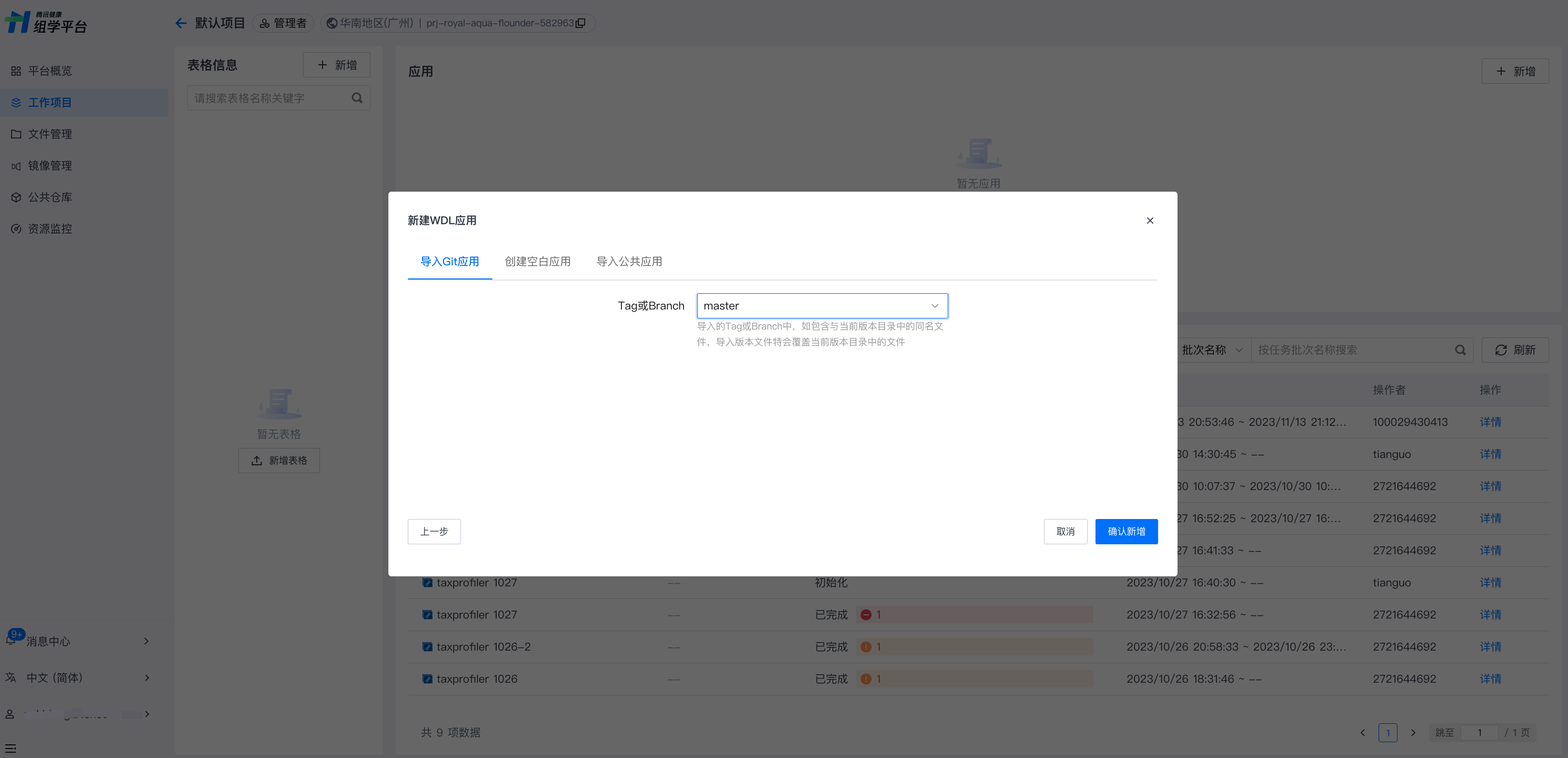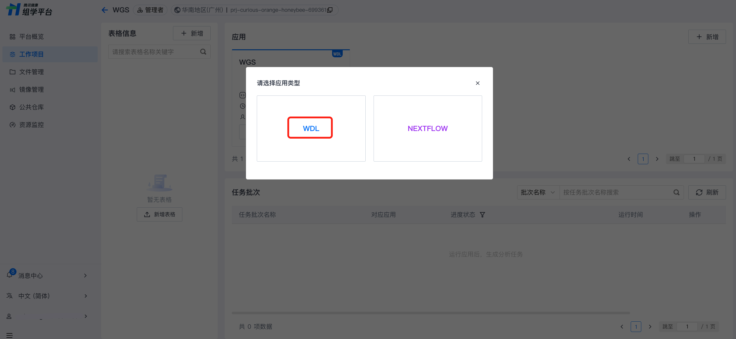 在选定工作项目页面,选择应用栏的新增,选择应用类型为 WDL,输入必要信息(应用名称、类型等)提交即可创建新应用。