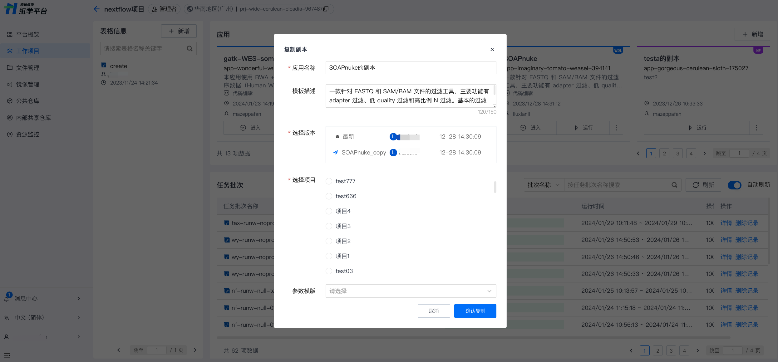 在“复制副本”弹窗内填写应用名称、描述,选择应用版本、目标项目和参数模版(可选),确认后完成复制。可在目标工作项目中查看、编辑或运行应用。
