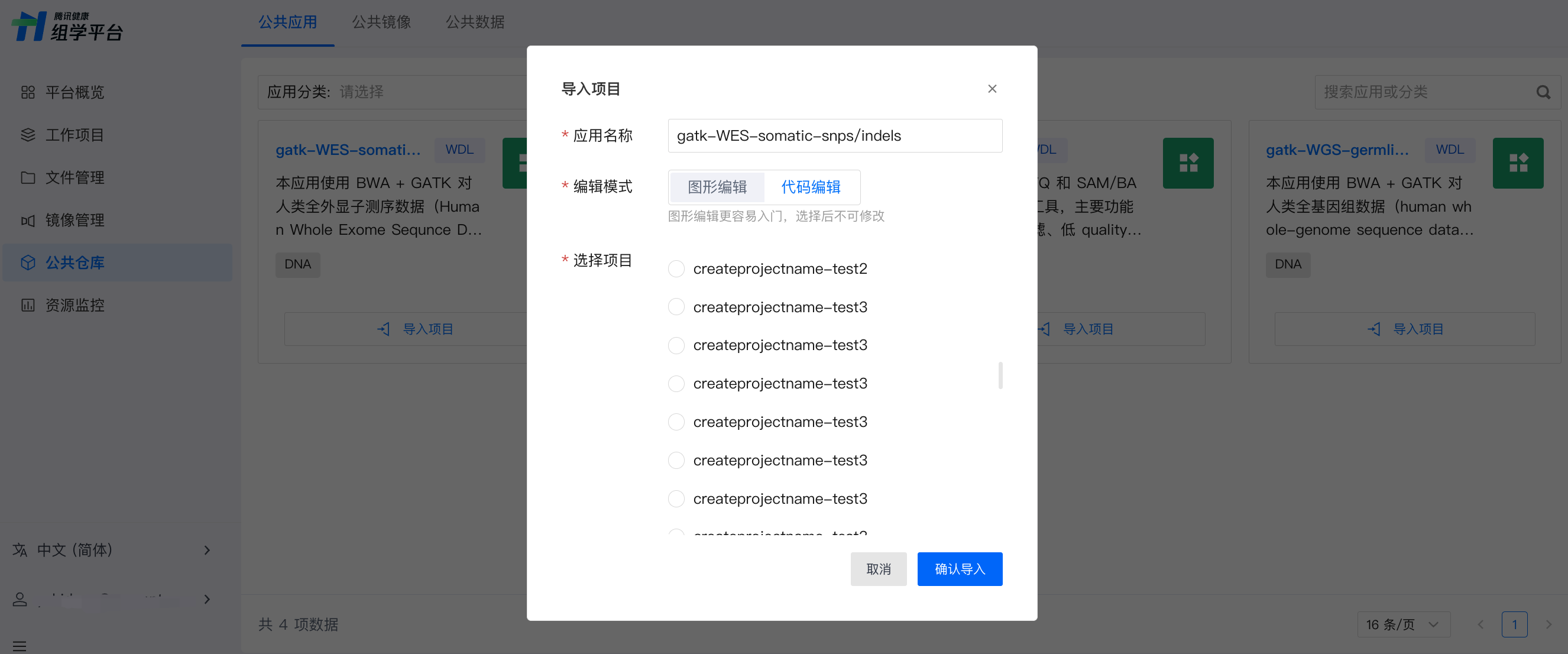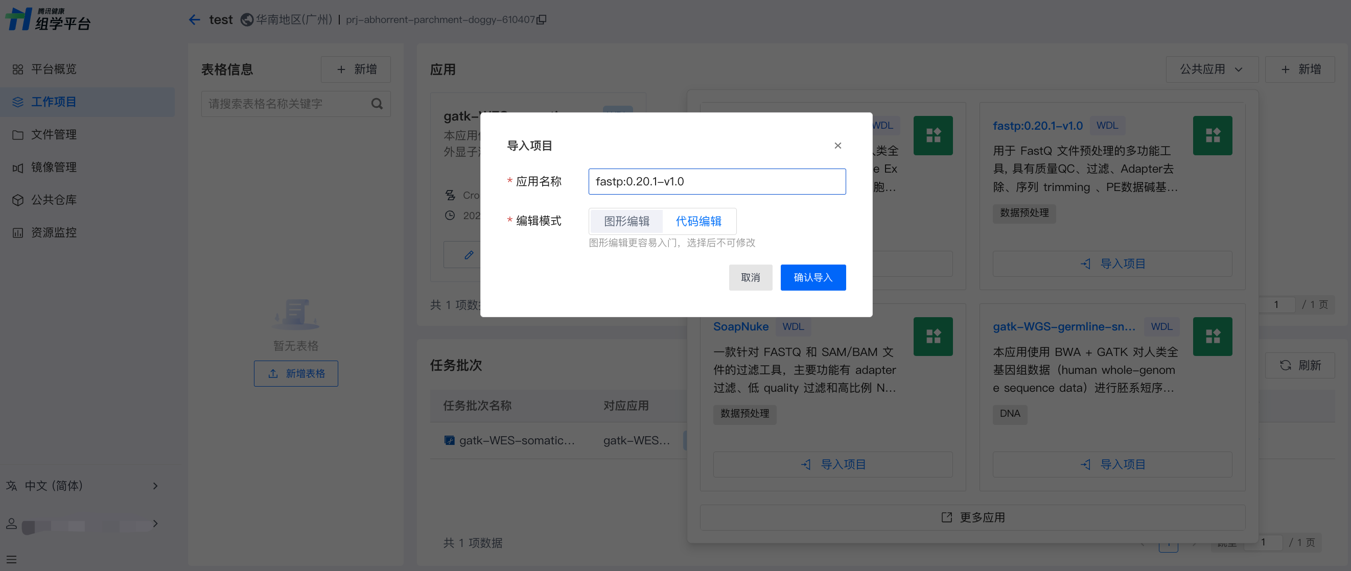 显示导入项目弹窗,填写应用名称,选择应用导入的工作项目(公共应用暂仅支持代码编辑模式使用)。