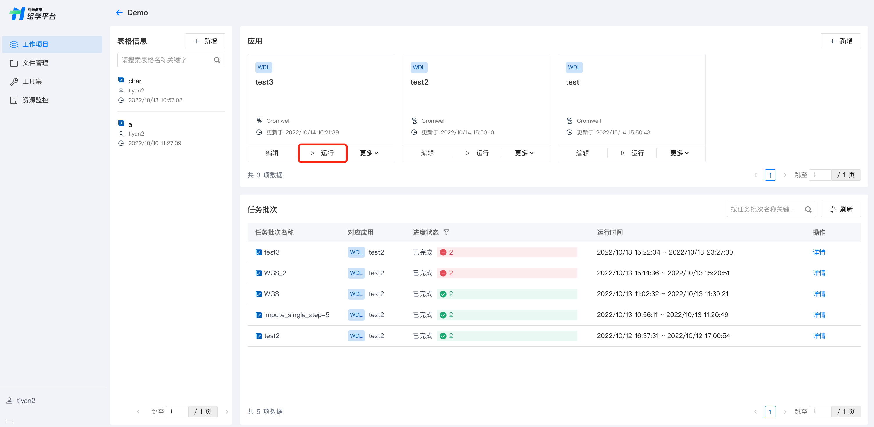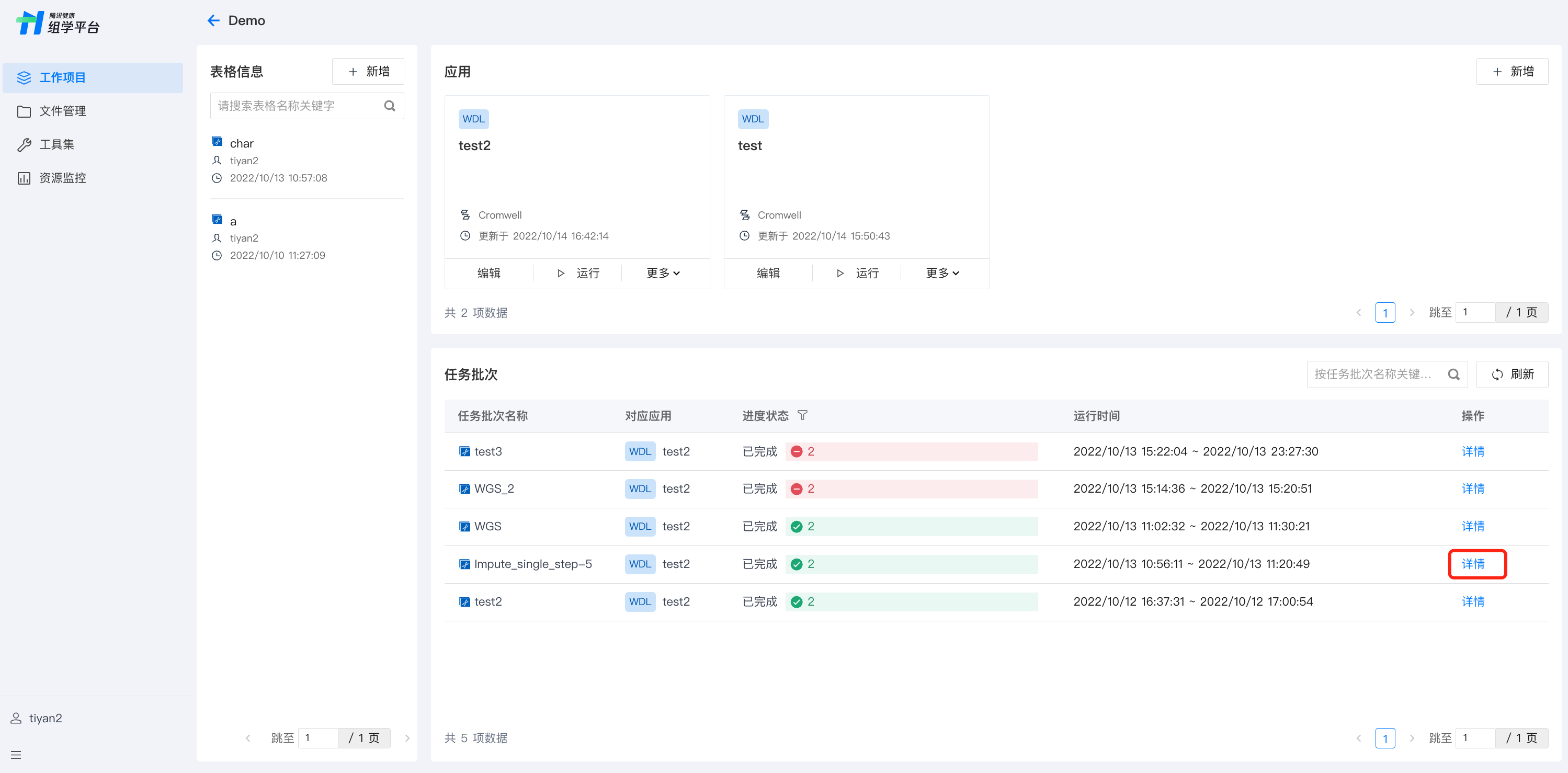 工作项目中,显示各个任务批次的运行进度及时间。