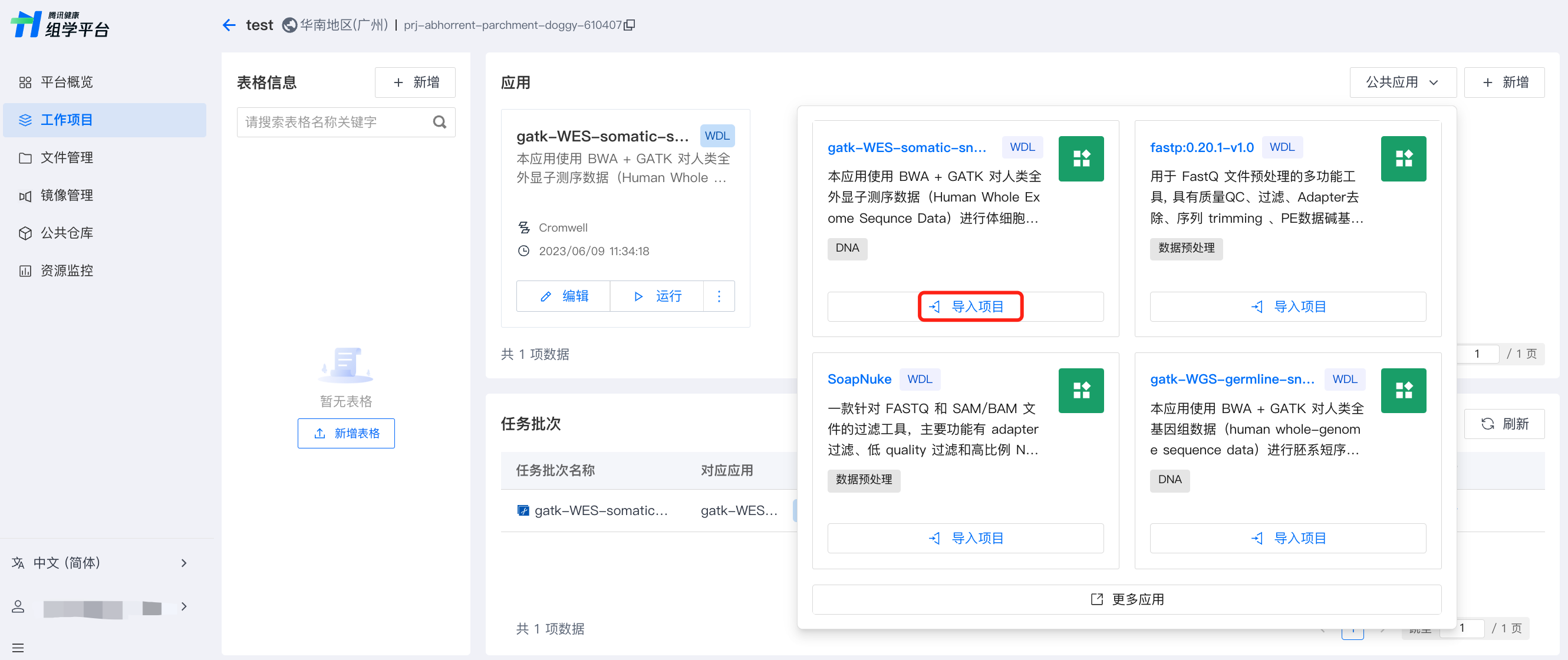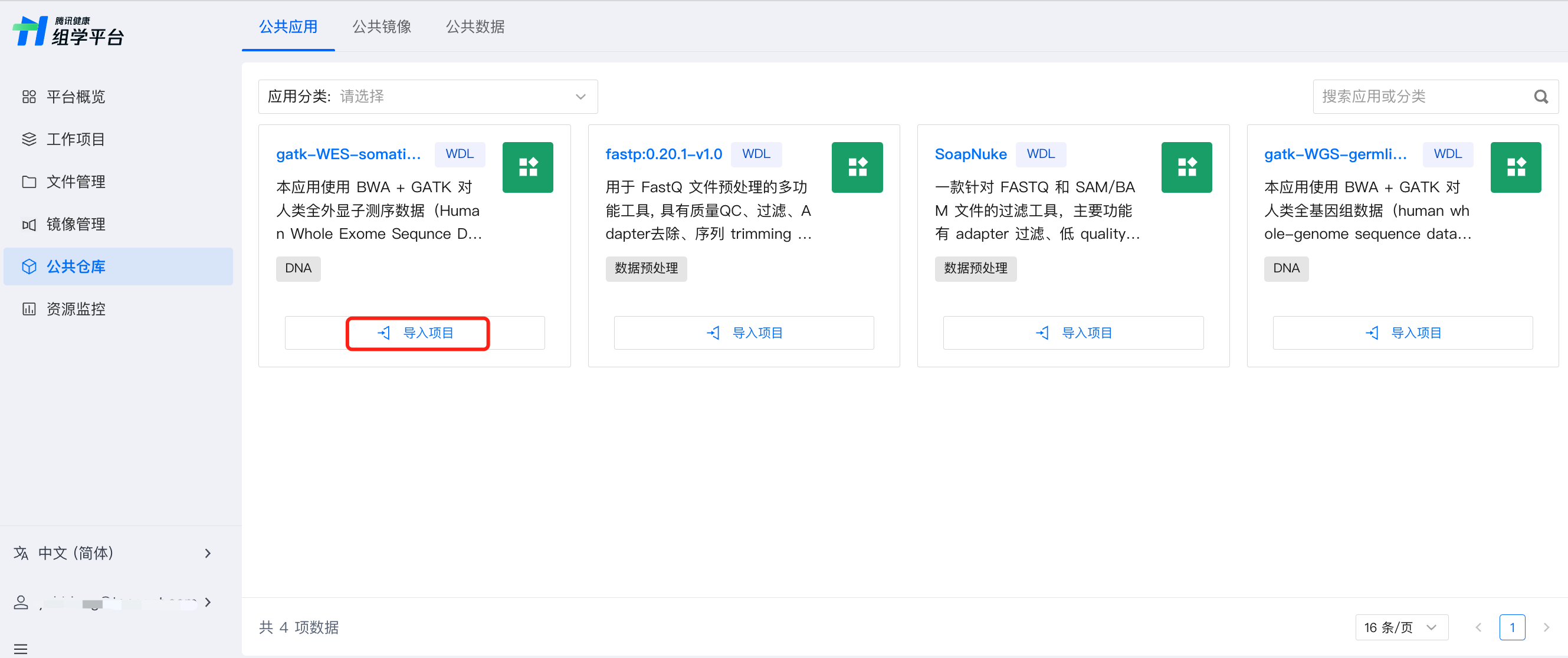 首页侧边栏选择公共仓库,上方 Tab 切换至公共应用,通过搜索名称或筛选分类,找到需要的公共应用,单击该应用卡片的导入项目。