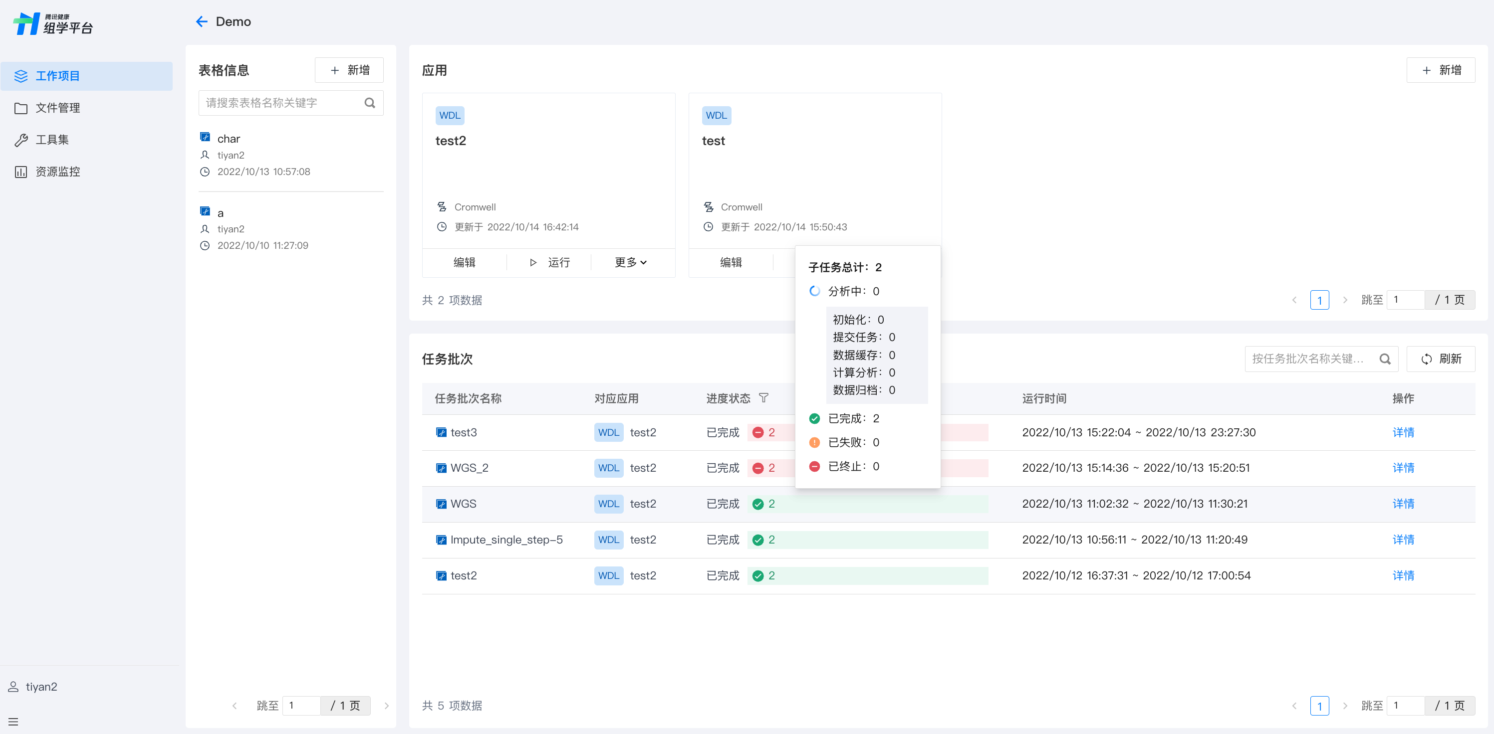 在任务批次栏,每行数据对应一次投递的所有子任务组的状态,对应状态显示的是该批次所有子任务状态的汇总,悬停在状态栏上方会显示具体进度。