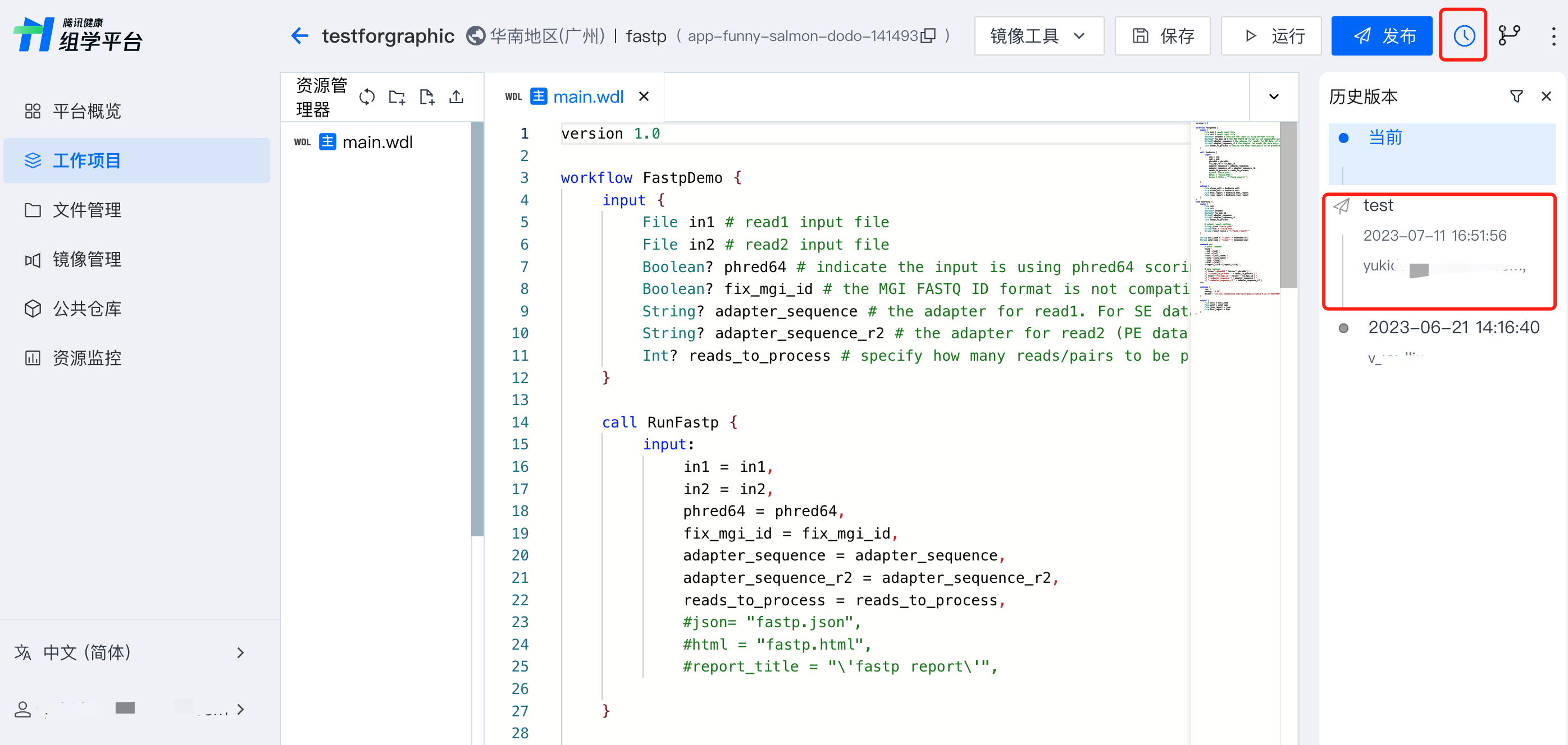 发布完成后,在历史版本时间轴内可切换至该版本,支持查看和运行该历史版本。