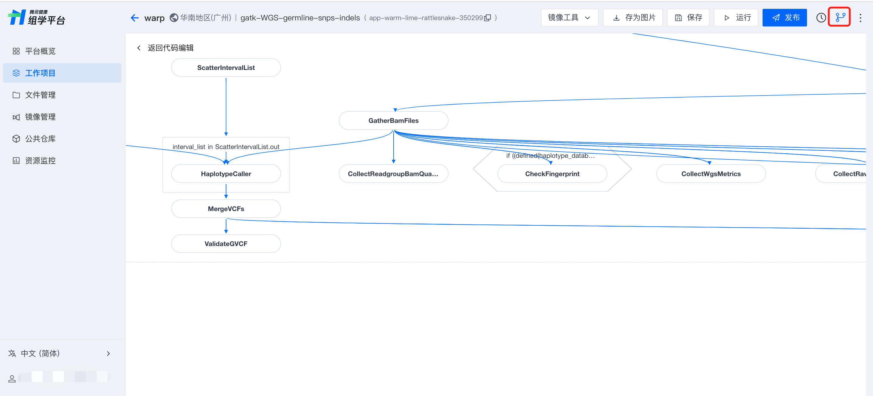 按照 WDL 语法规范编写 WDL 工作流,完整 WDL 语法可参见 WDL 官方文档 。 DAG 概览图可帮助梳理任务之间的依赖关系,单击右上角 DAG 按钮即可查看当前应用概览图, 目前仅支持查看单 WDL 应用的 DAG 概览图。