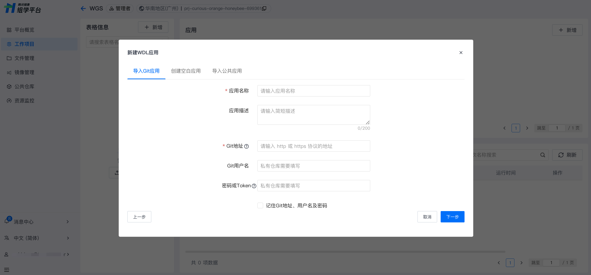 1. 填写应用基本信息(如应用名称、描述等)和 Git 仓库相关信息,私有仓库需填写 Git 用户名及密码(如涉及 Github 地址,请填写 Token)。