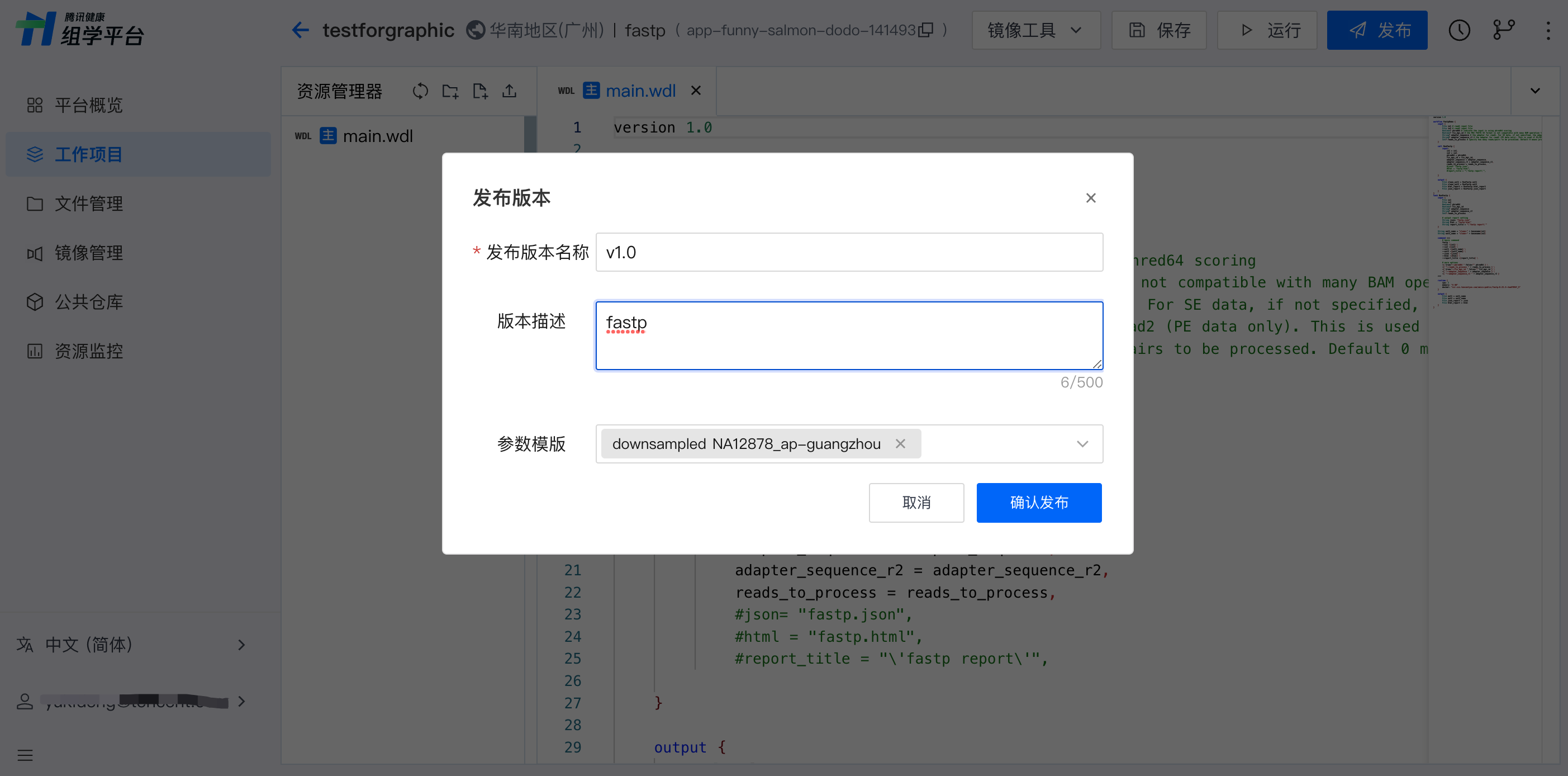 单击发布会触发保存和校验流程,通过校验后进入发布流程,显示弹窗“发布版本”,填写发布版本名称、描述,选择参数模板后确认,完成发布。