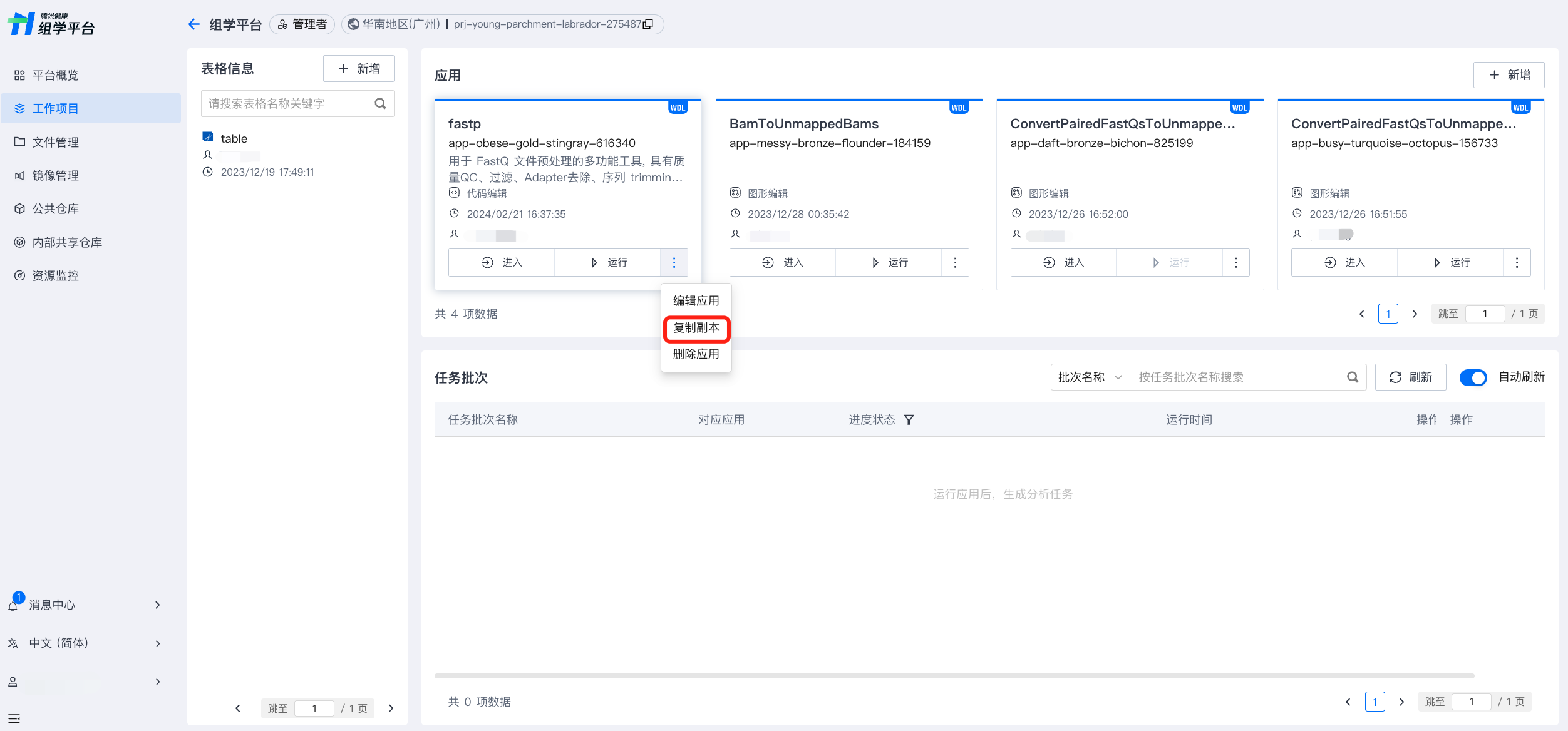 平台支持在项目内或跨项目快速复制应用副本。如需复制应用,可点击应用卡片扩展选项,选择“复制副本”;