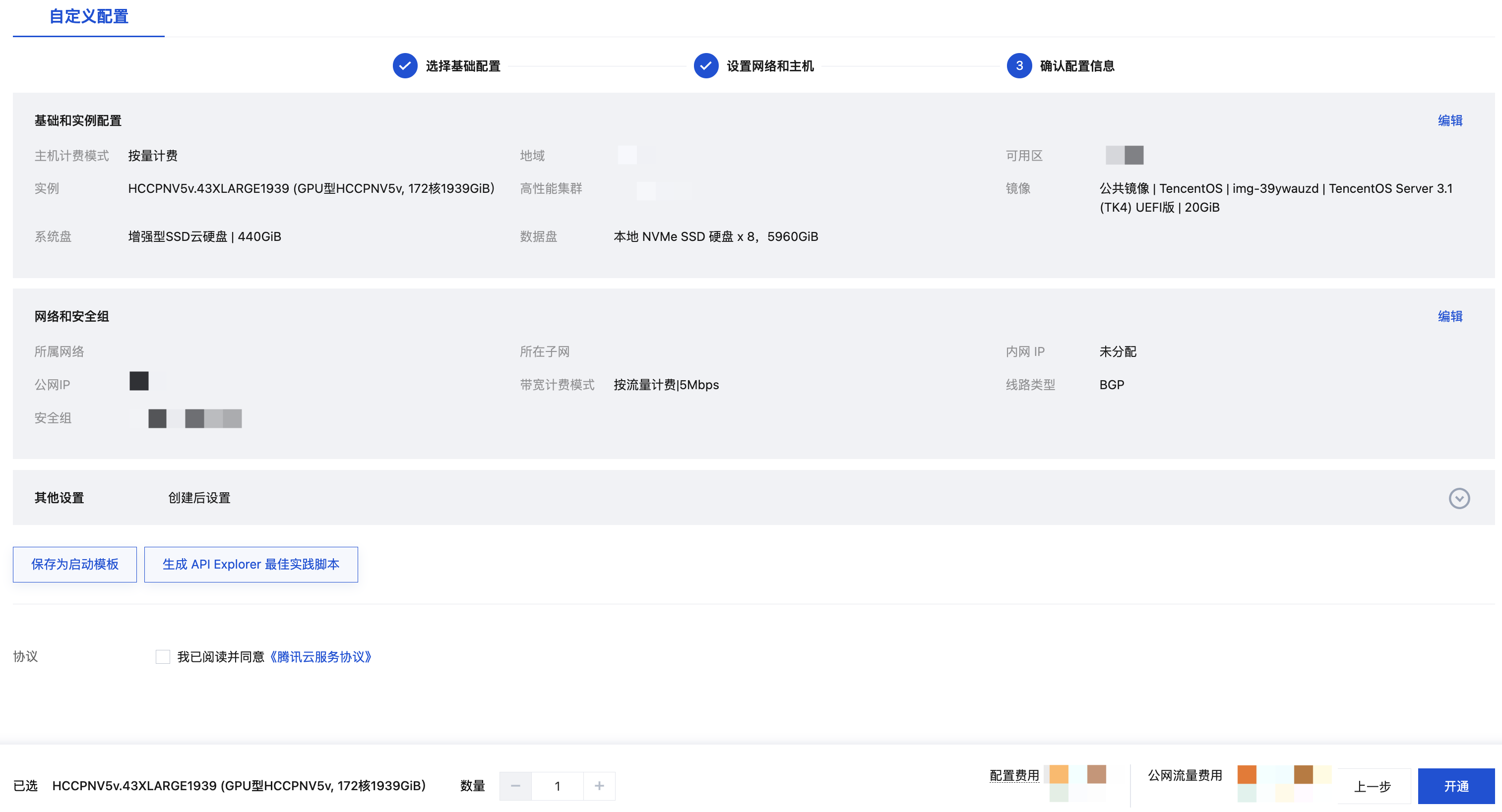 确认实例规格、镜像选择、存储和公网配置选择以及安全组等配置项是否符合预期。