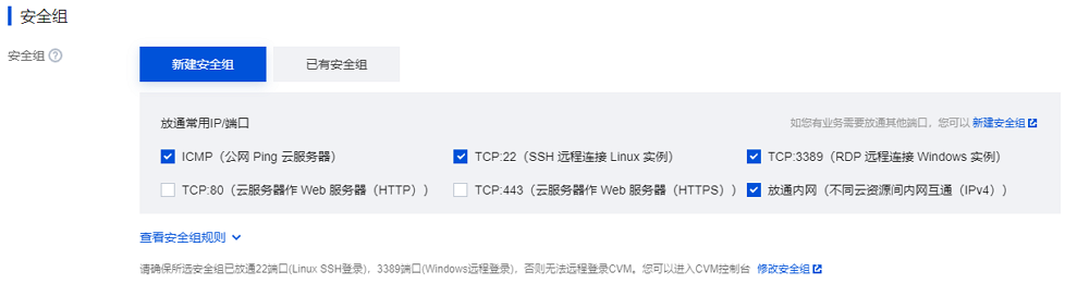 2. 新建或选择已有安全组,控制端口的开放范围。如下图所示: 3. 设置高性能计算集群实例的登录密码或密钥。