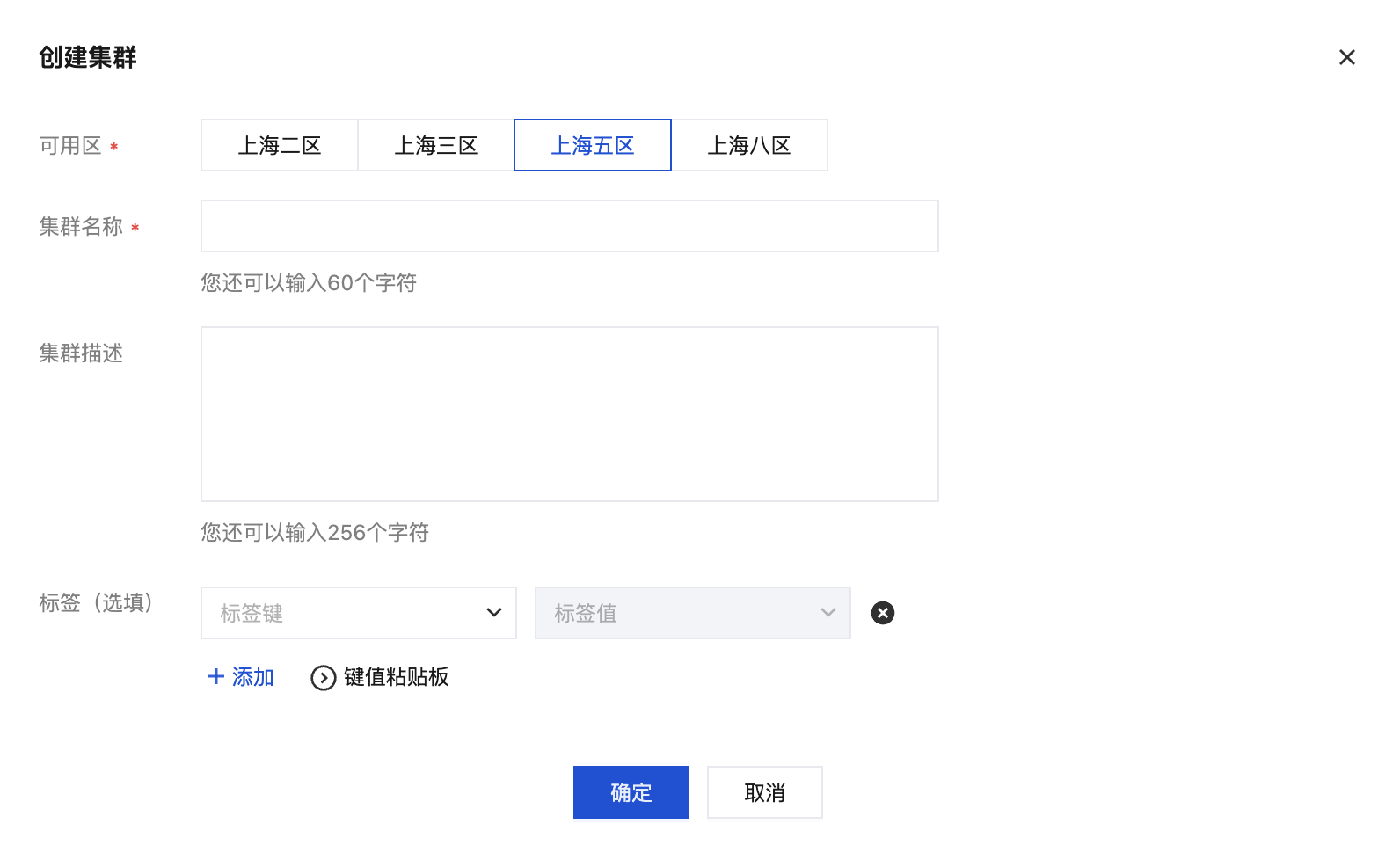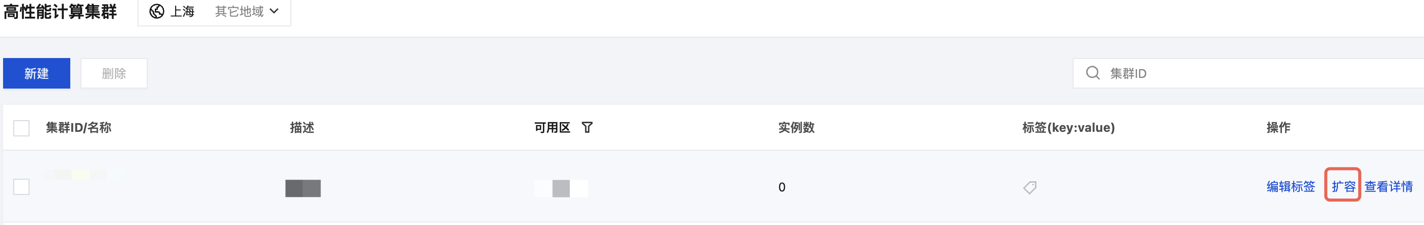 1. 登录 云服务器控制台,在左侧导航栏选择高性能计算集群 > 集群资源。 2. 在高性能计算集群页面上方,选择目标地域,单击新建。本文地域以选择上海为例,GPU 型 HCCPNV5v 实例可售卖地域请参见 实例售卖地域。 3. 在弹出的创建集群窗口中,按需配置可用区、集群名称、集群描述及标签,如下图所示: