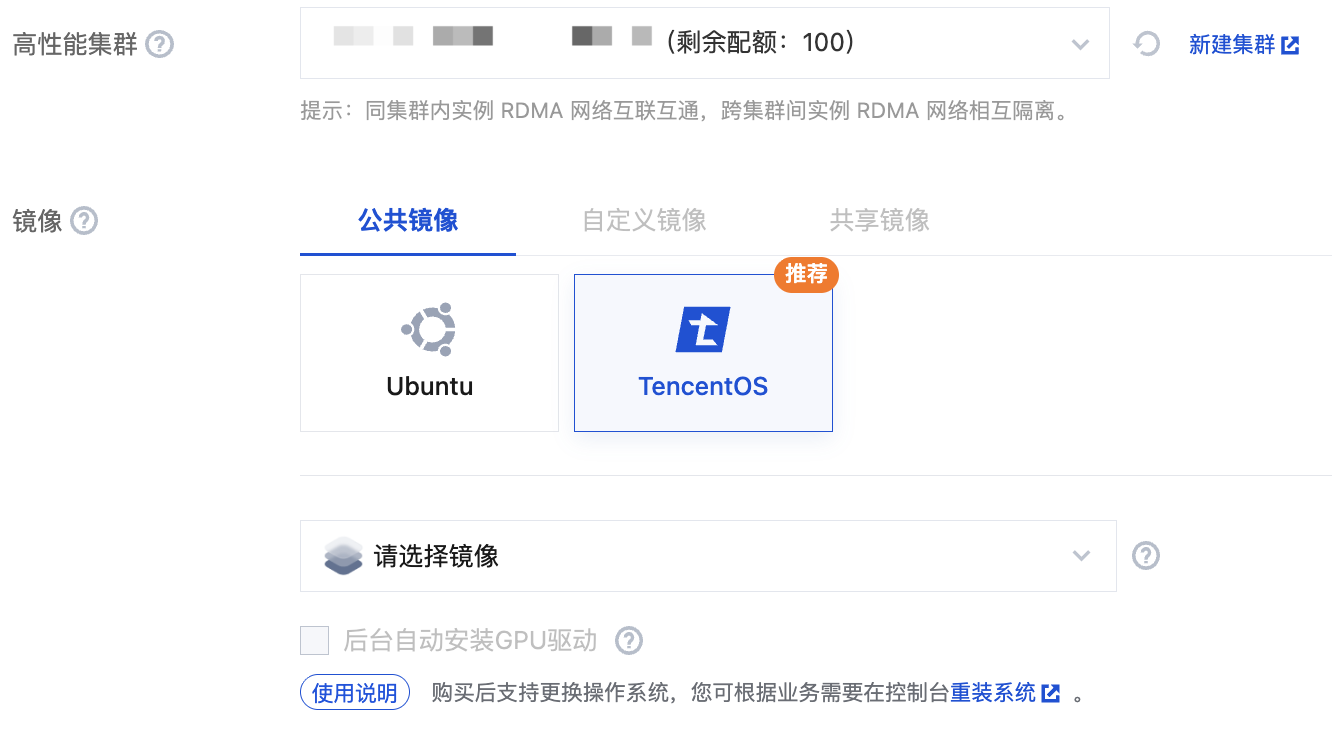 若选择公共镜像,部分实例支持勾选后台自动安装 GPU 驱动即可预装相应版本驱动,建议您选择该方式。该方式仅支持部分 Linux 公共镜像。
