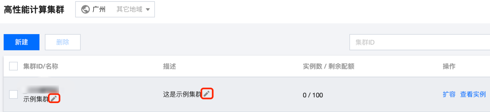 2. 在高性能计算集群页面,选择需要修改的集群名称或描述右侧的 ,如下图所示。 3. 在弹出的修改名称或修改描述窗口中,输入新的集群名称和集群描述,单击确定,完成操作。
