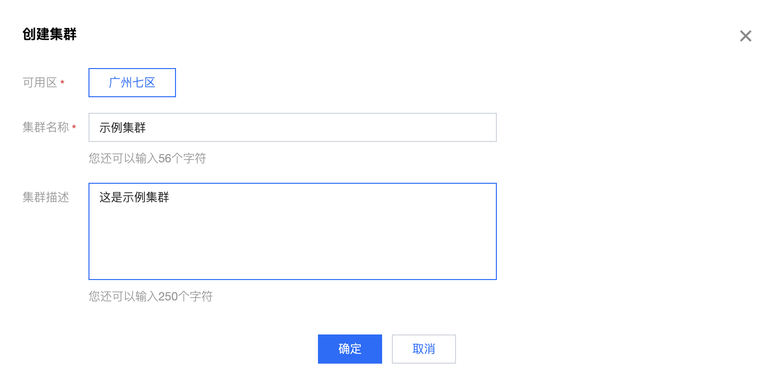 4. 在弹出的创建集群窗口中,选择填写可用区、集群名称、集群描述信息。