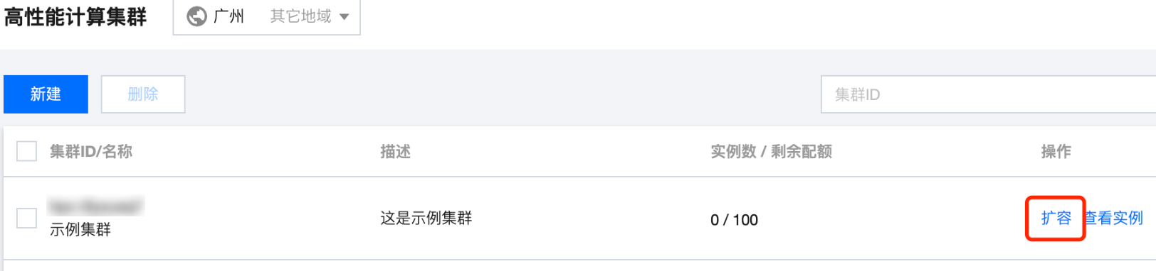 2. 在高性能计算集群页面,选择需要扩容的集群单击扩容,进入实例购买页。