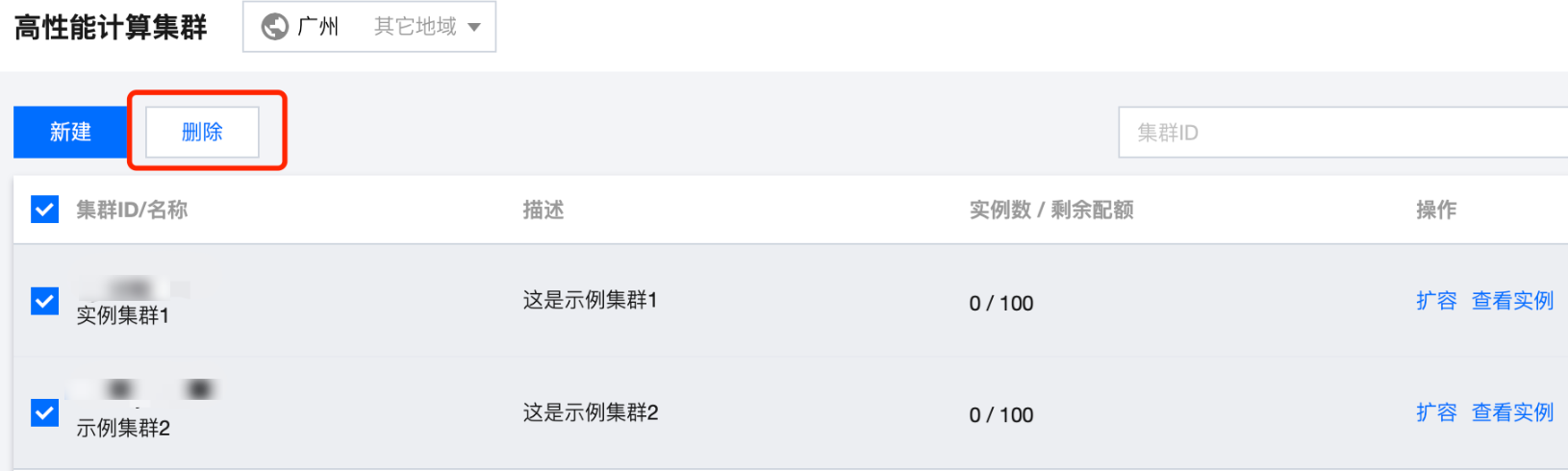 2. 在高性能计算集群页面,按需勾选一个或多个集群后,单击删除。