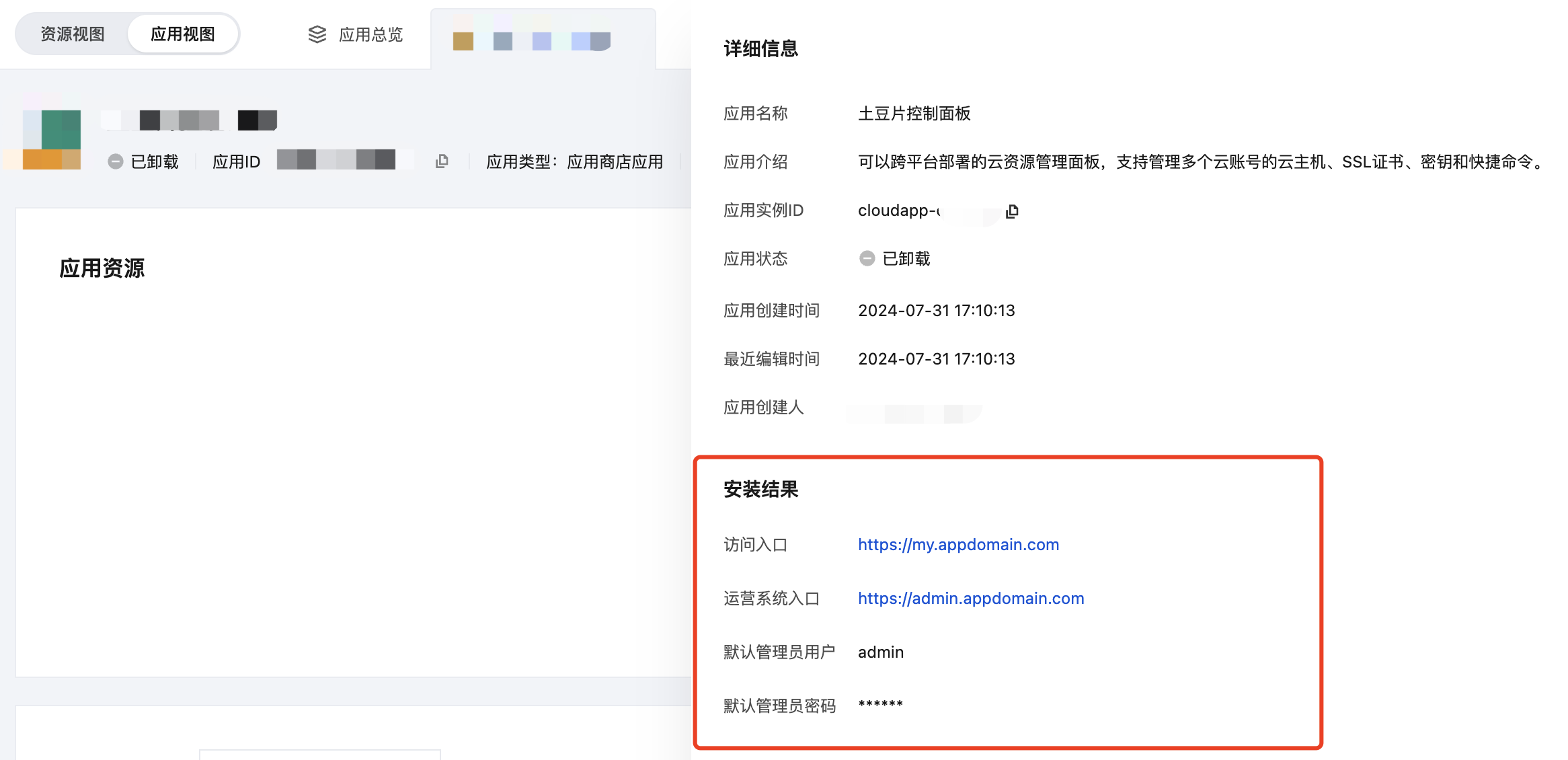 应用安装后的结果,需要提供给客户。例如应用的访问地址、管理系统的地址或者管理系统的初始密码等。可以通过在 tf 文件中声明 output 实现。