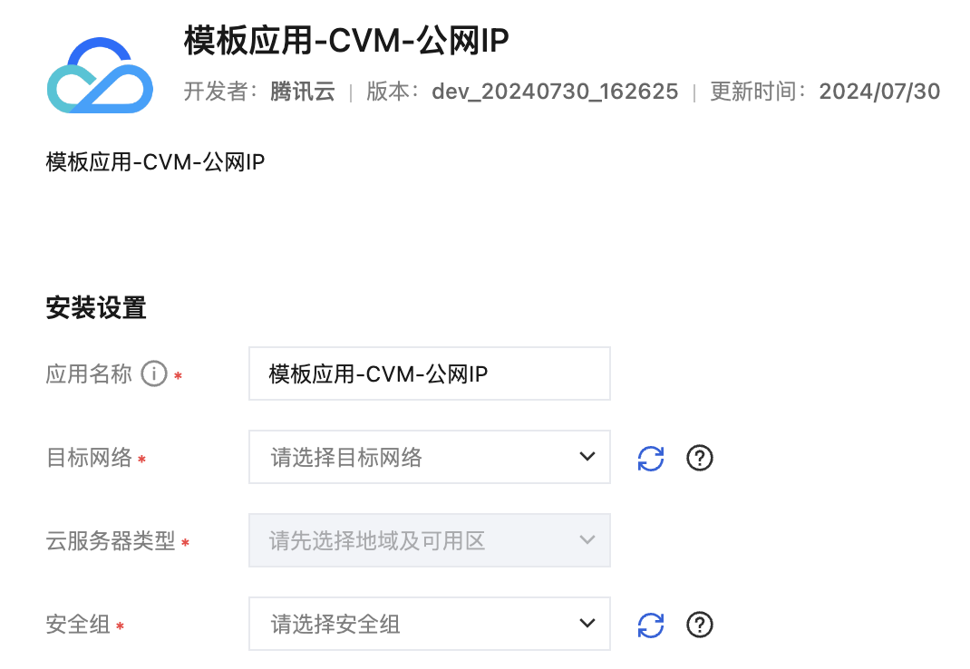 安装包可以在 package.yaml 中声明安装参数,云市场将为这些声明的安装参数生成相应的安装界面。以下示例来自云市场模板 CT_001_cvm-ip