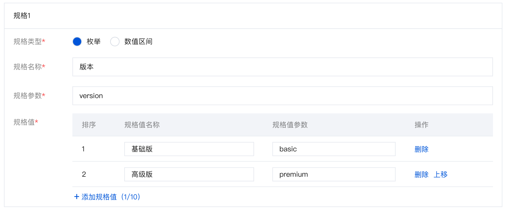 枚举类 | 指有限且可明确定义数量的规格,适用于只有少量的规格值。例如:商品版本为基础版、高级版、至尊版等。 | 例如:规格为“版本”,规格值为“基础版”、“高级版” | |