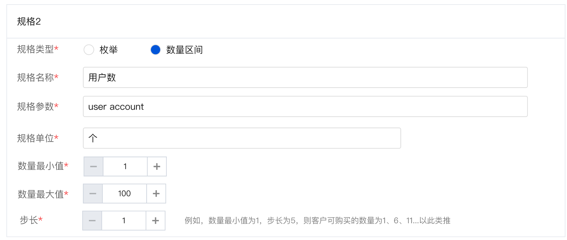 数值区间类 | 指范围比较大且无法一一枚举的规格,适用于无法量化的规格值。例如:用户数为1~100个等。 | 伙伴需要对应填写最小值、最大值和步长。支持输入1~999999范围内的整数。 步长指客户可购买的数量间距。例如:数量最小值为1,步长为5,则客户只能购买1、6、11等以此类推的数量。 | 客户可输入需要购买的数量 |