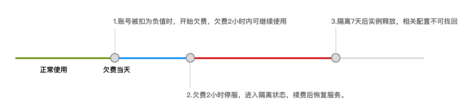 从您的账户余额被扣为负值时刻起,按量计费网关负载均衡在2小时内可继续使用且继续扣费,2小时后(上图中点2)网关负载均衡将进入隔离状态,实例被隔离后将进行停服处理(服务不可用,仅保留配置数据)且停止扣费,续费后恢复服务。