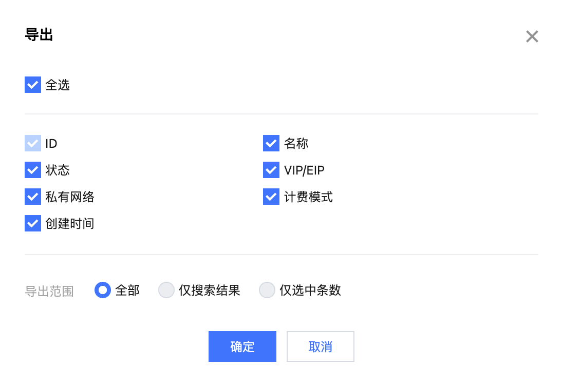可导出的字段包括:ID、名称、状态、VIP/EIP、私有网络、计费模式、创建时间。
