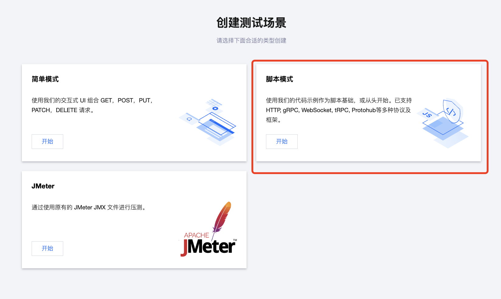 脚本模式 | 使用我们的 JS 代码示例作为脚本的基础,或从头开始。支持 HTTP、Websocket、gRPC 等协议。 |