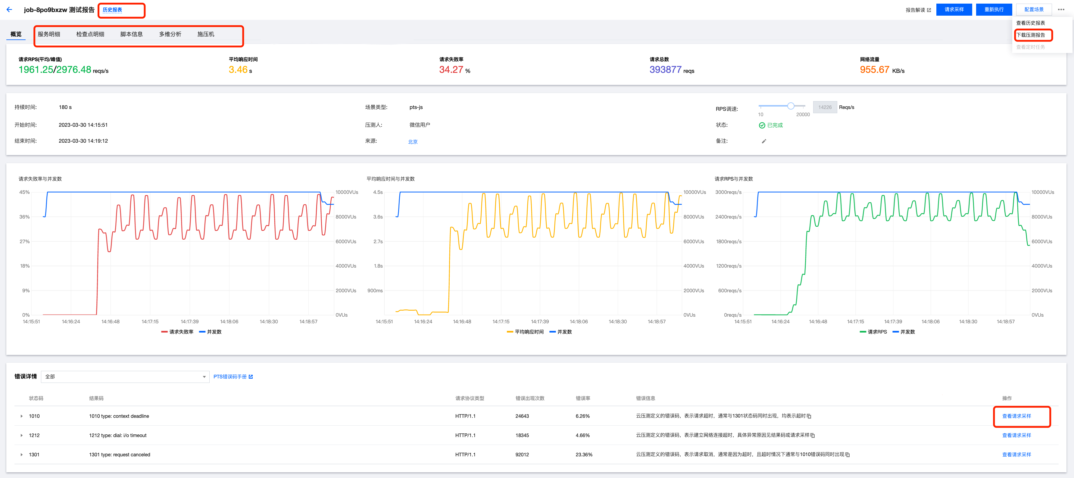 施压配置 | 当前支持压力模型为:并发压力模式(虚拟用户模式)、RPS 压力模式。 并发压力模式(虚拟用户模式):并发指虚拟并发用户数。从业务角度,也可以理解为同时在线的用户数。 RPS 压力模式:每秒请求数量,用于衡量服务端的吞吐量。免去并发数到 RPS 的繁琐转换,来帮忙用户更好的摸底业务性能瓶颈。 并发模式配置内容 最大并发数:可以理解为被压服务同时在线的用户数。 递增步数:并发压力递增的阶段数量。 递增时长:压力递增持续时间。 压测总时长:压测持续时间。 压测资源: 单压测资源默认提供 500 并发,以及对应的底层资源; 若 CPU、内存或出入带宽达到上限,可适当增加压测资源,提高分配给任务的 CPU、内存和出入带宽; 压测资源数增加会带来计费的增加,计费并发 = 压测资源数 * 500。 网络类型:通用网络支持公网访问。 流量分布:选择不同地域施压流量占比。 RPS 模式配置内容 最大 RPS:压测 RPS 上限,用来摸底业务系统的目标吞吐量。PTS 会根据最大 RPS 为压测任务分配合理的施压资源。 起始 RPS:压测起始 RPS,用户可以在压测过程中手工调整发压 RPS,并观察报表指标变化。 压测总时长:一次压测的总时长。 压测资源:PTS 会根据用户设置的最大 RPS,合理分配压测资源池。如果您的请求响应较慢,您可以通过适当扩大压测资源池,来确保达到目标吞吐量。 流量分布:将压测总流量以一定的百分比,分布于多个地域,以模拟真实场景中,来自不同地域的用户带来的流量。 |