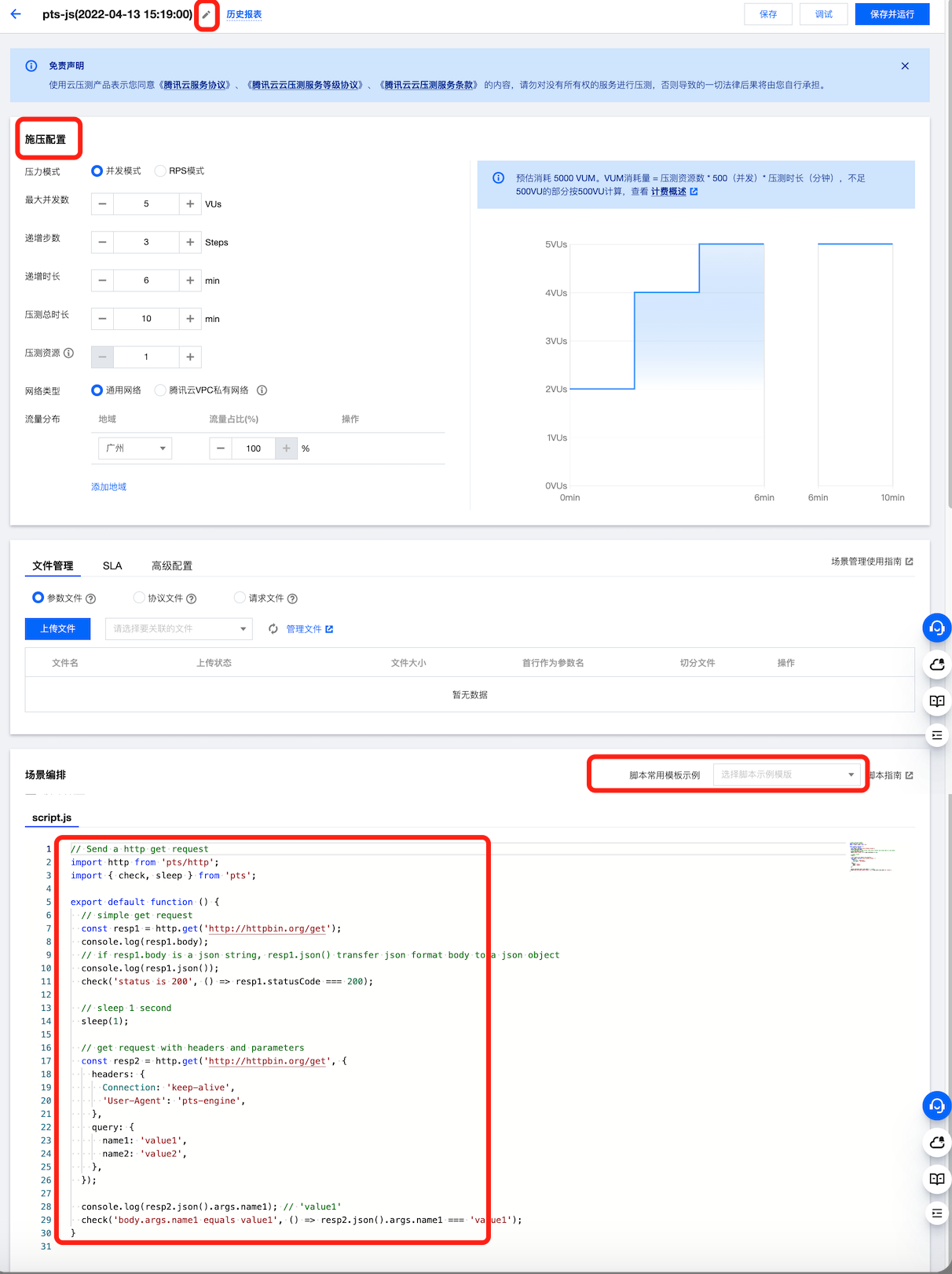 场景编排 | 提供脚本常用模板示例。 支持语法高亮、智能提示、函数引用、代码格式化等。 JS 编排区域内右键查看更多功能。更多常用的 JS 语法,代码示例请参见 脚本模式压测。 |