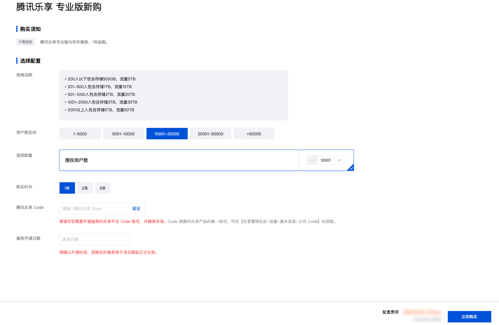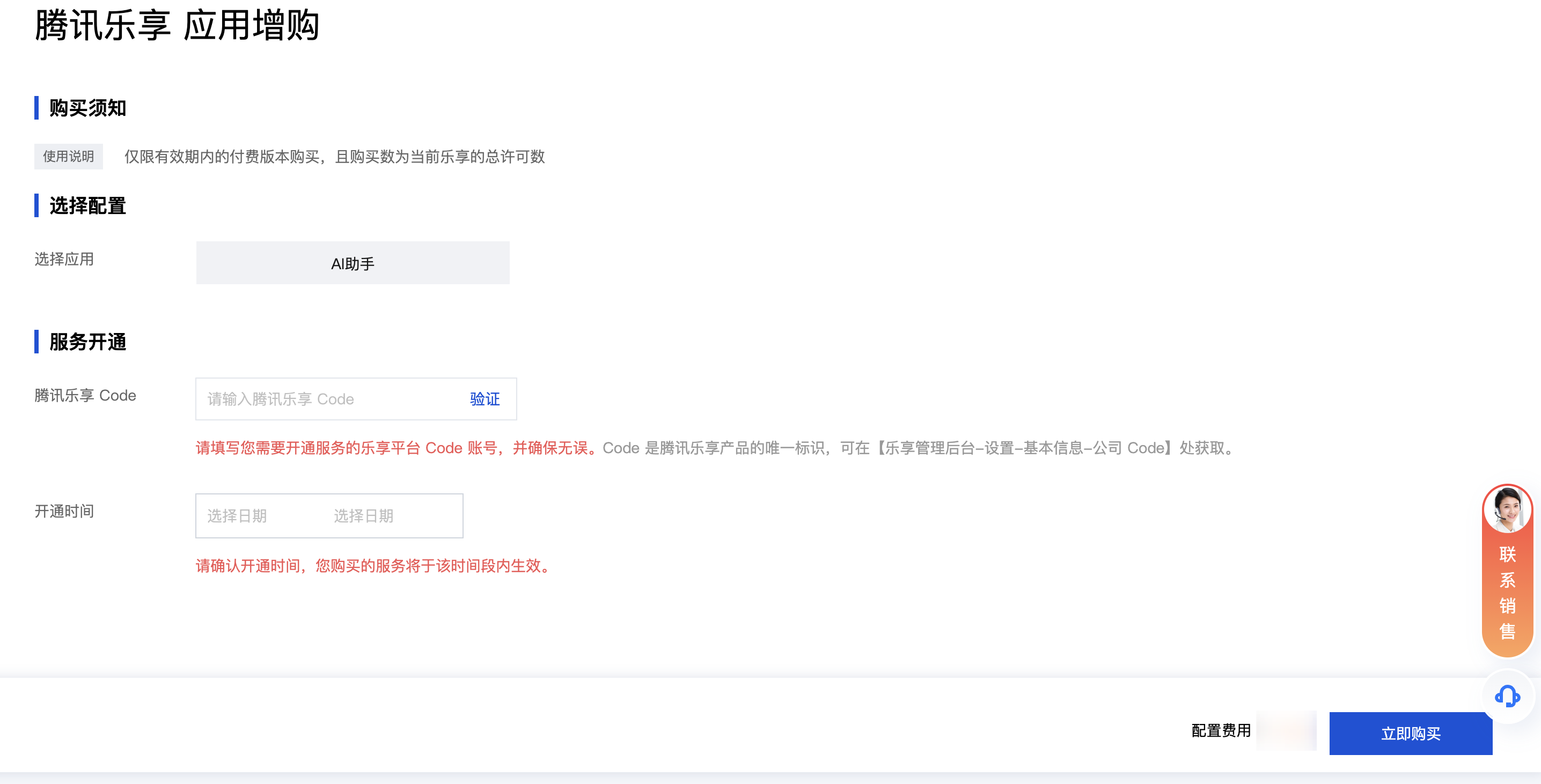 1. 您需要先 注册乐享,并获取乐享的唯一标识 Code。Code 可在乐享管理后台 > 设置 > 基本信息 > 公司 Code 处获取。 2. 访问腾讯乐享专业版和腾讯乐享 AI 助手购买页,配置具体的购买参数。