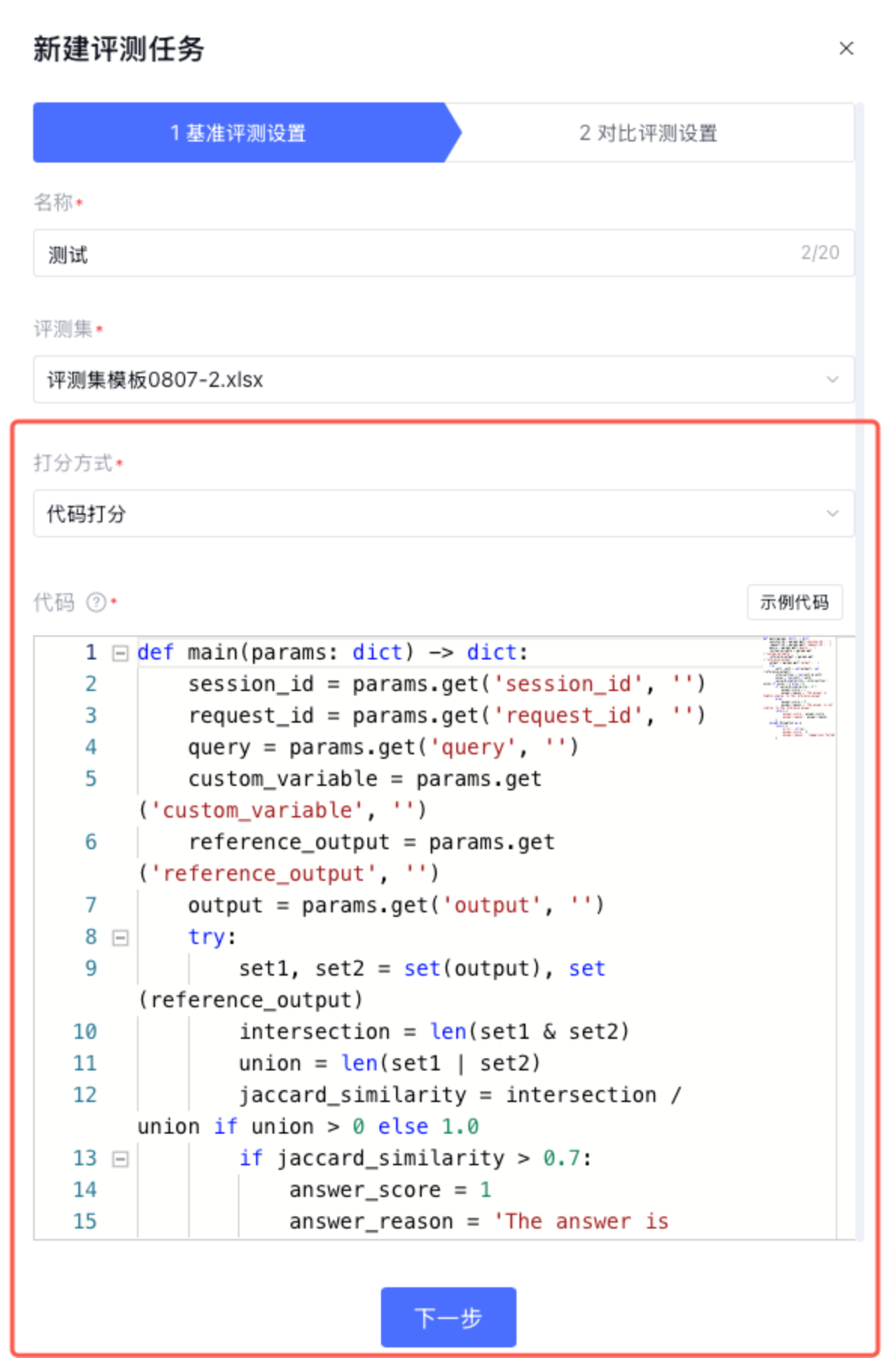 3. 代码打分:通过编写代码对输出结果进行打分,目前支持Python语言。可直接引用评测集中的 query 、预置列和自定义列。