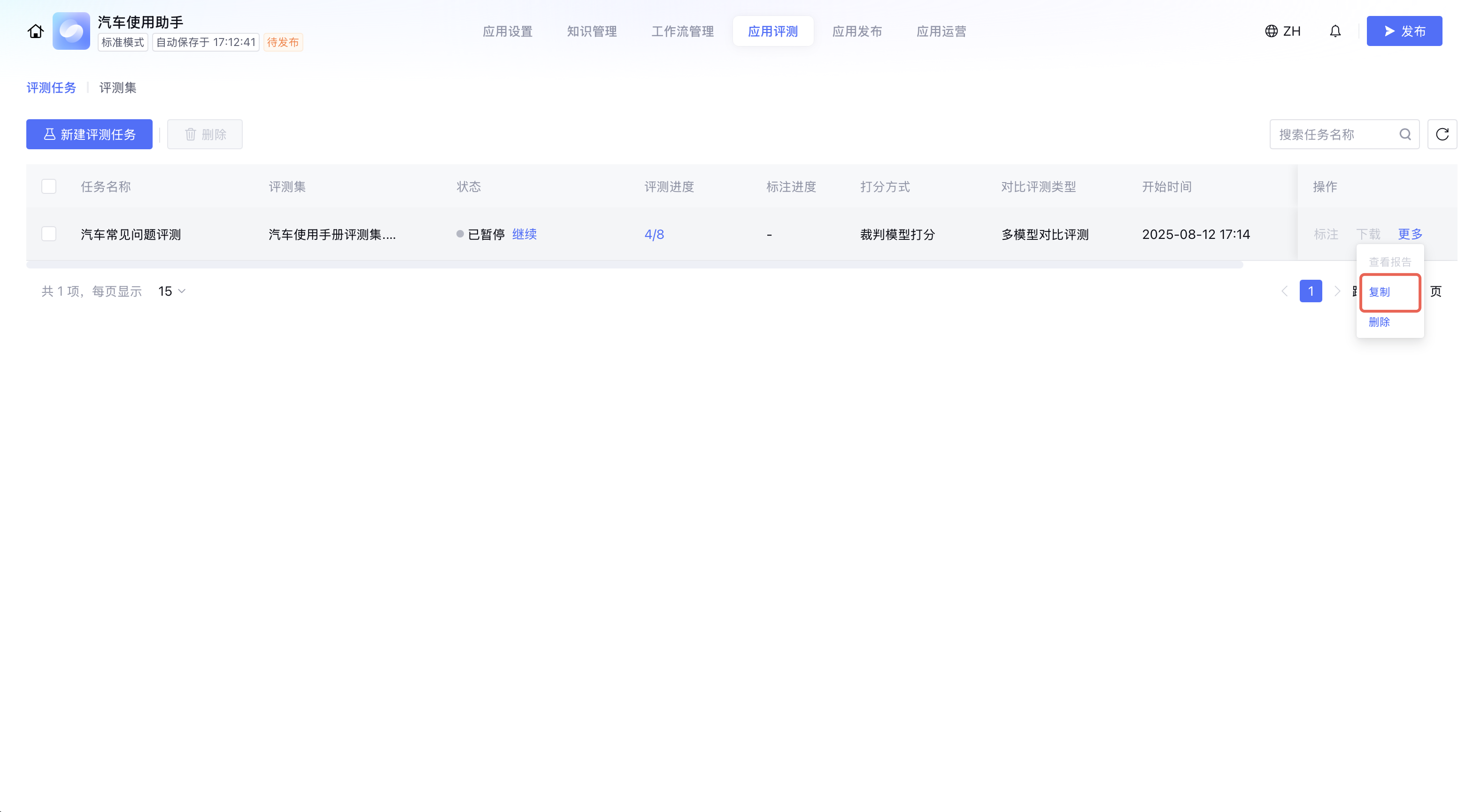 复制:新建一个评测任务,该任务保留当前评测任务的基准评测和对比评测配置内容。