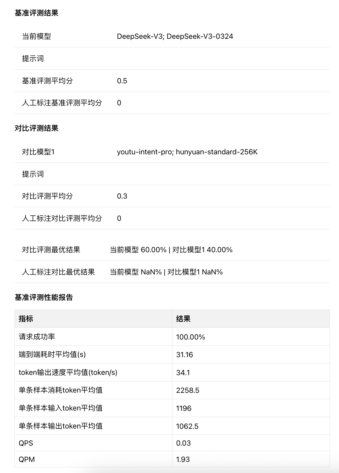 跑批完或评测完后可以查看报告,报告中展示评测配置信息、基准评测结果、对比打分评测结果、基准评测性能报告等内容。