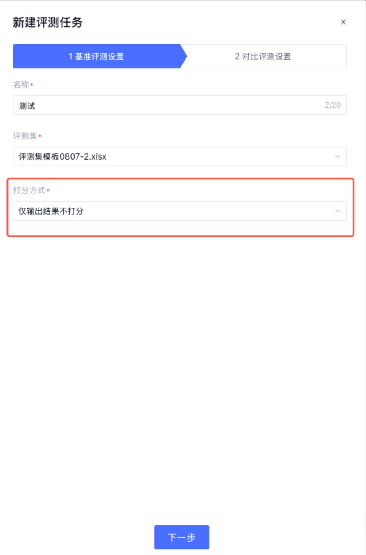 4. 仅输出结果不打分:仅批量运行评测集,不进行任何打分,直接输出结果。选择此方式时,相当于执行任务批处理。