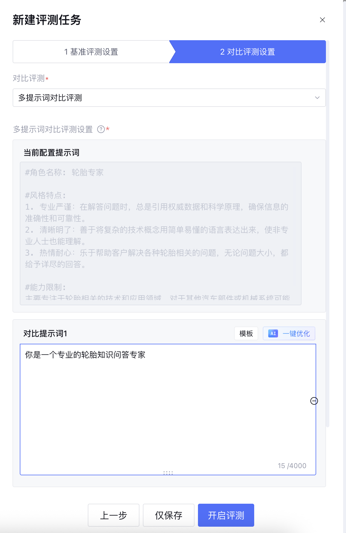 3. 多提示词对比评测:支持添加最多2组对比提示词,与当前配置提示词进行对比。如果对比提示词与当前提示词相同,系统会提示错误。