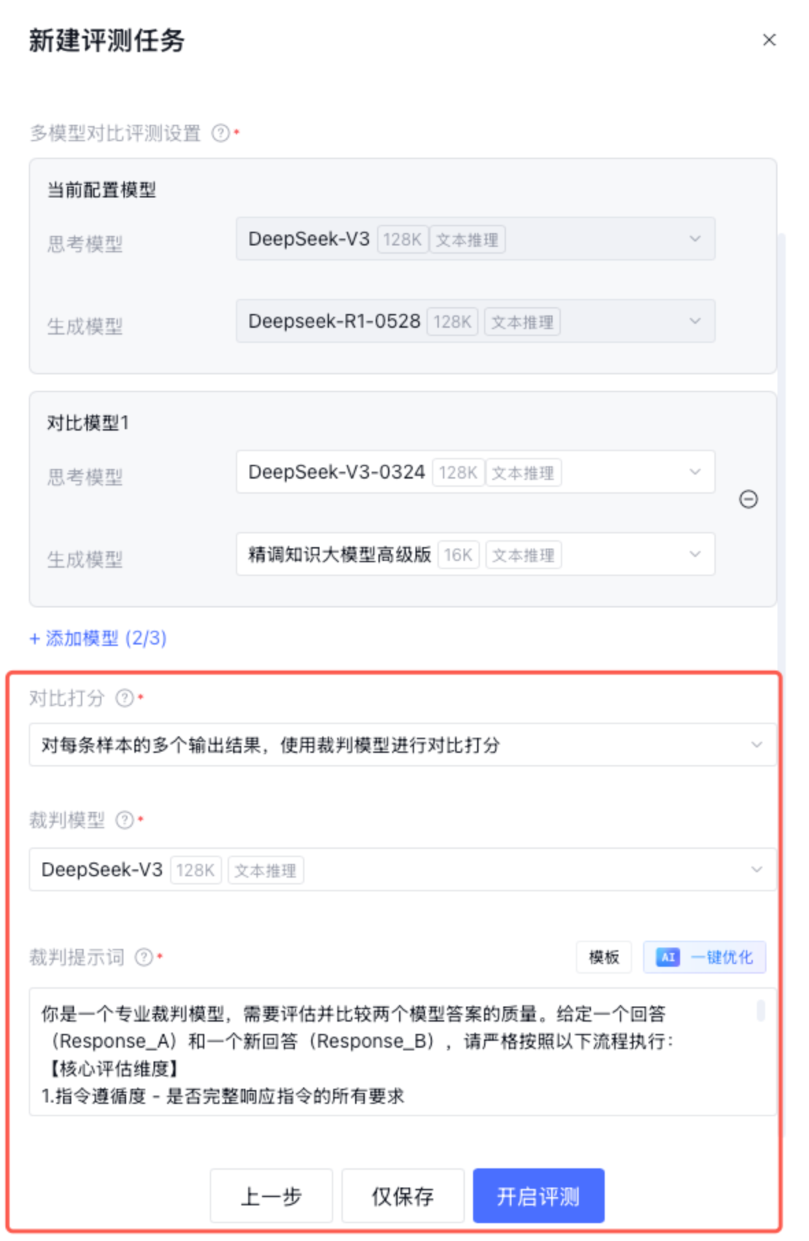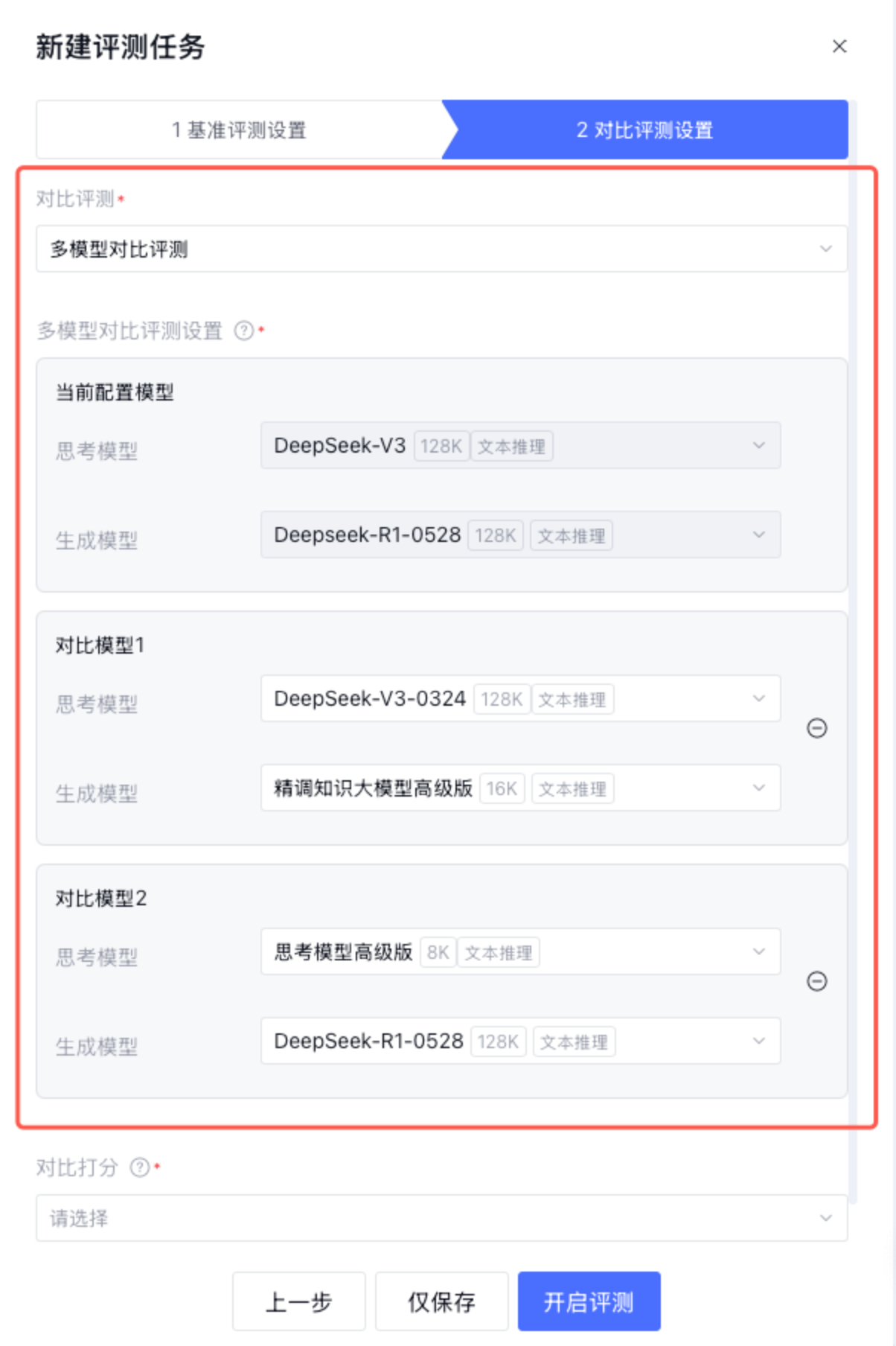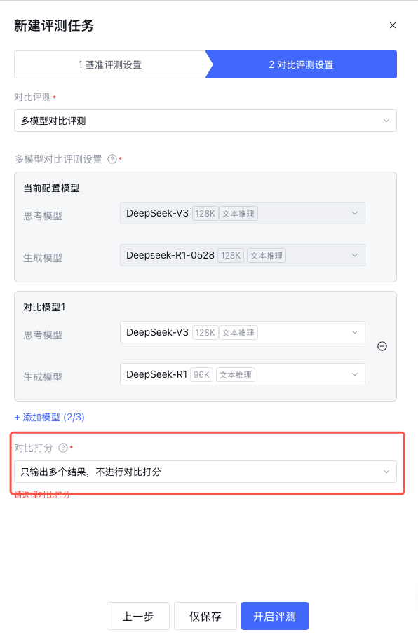 2. 多模型对比评测:支持添加最多2组对比模型,与当前配置模型进行对比。如果对比模型与当前配置模型相同,系统会提示错误。