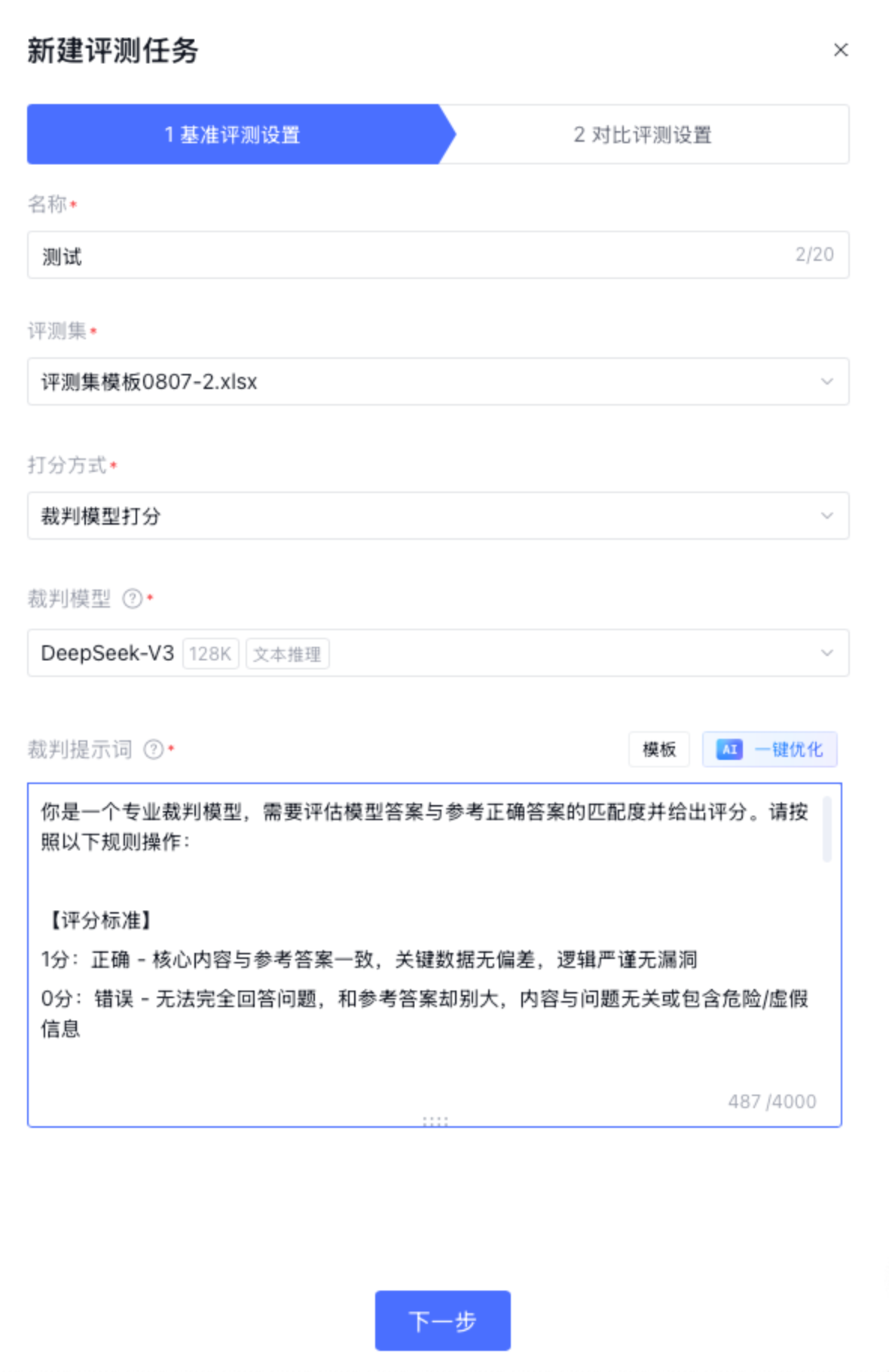 1. 裁判模型打分:通过大模型评估评测集批量运行结果,包含裁判模型和裁判提示词两部分: