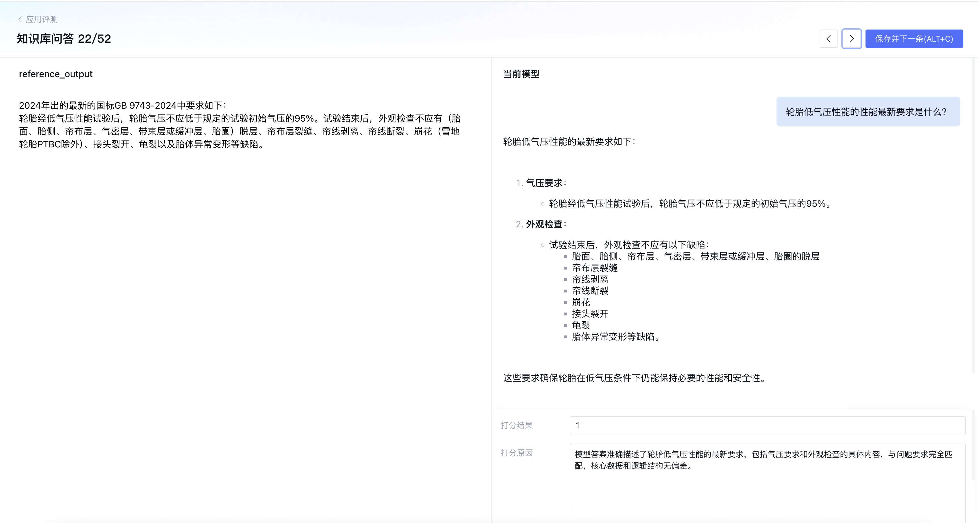 基准评测:批量运行应用输出并进行评估,可基于参考答案或自定义内容(通过自定义列传入),支持多种评分方式,包括裁判模型、规则或代码。
