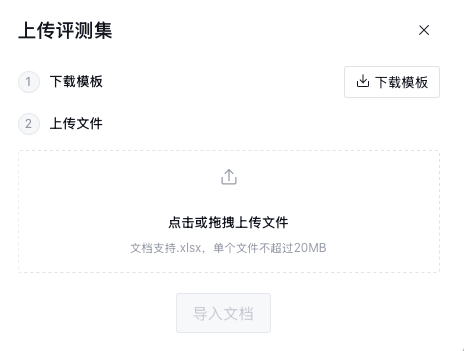 2. 单击上传评测集,弹出上传评测集窗口,参见评测集上传模板构建评测集文件。