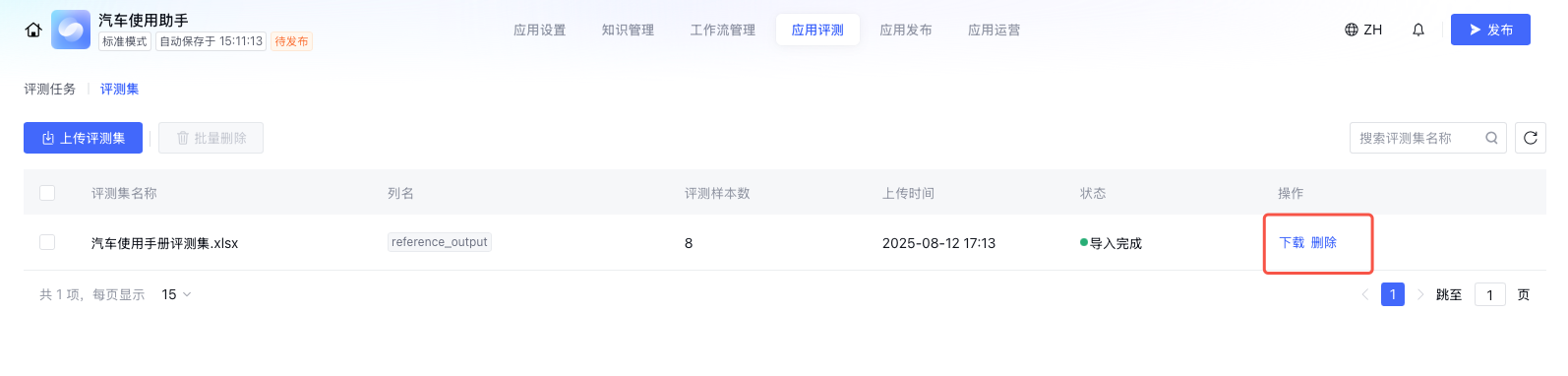 评测集是用于批量测试应用效果的测试数据集,评测集支持统一管理,可供后续多次使用。