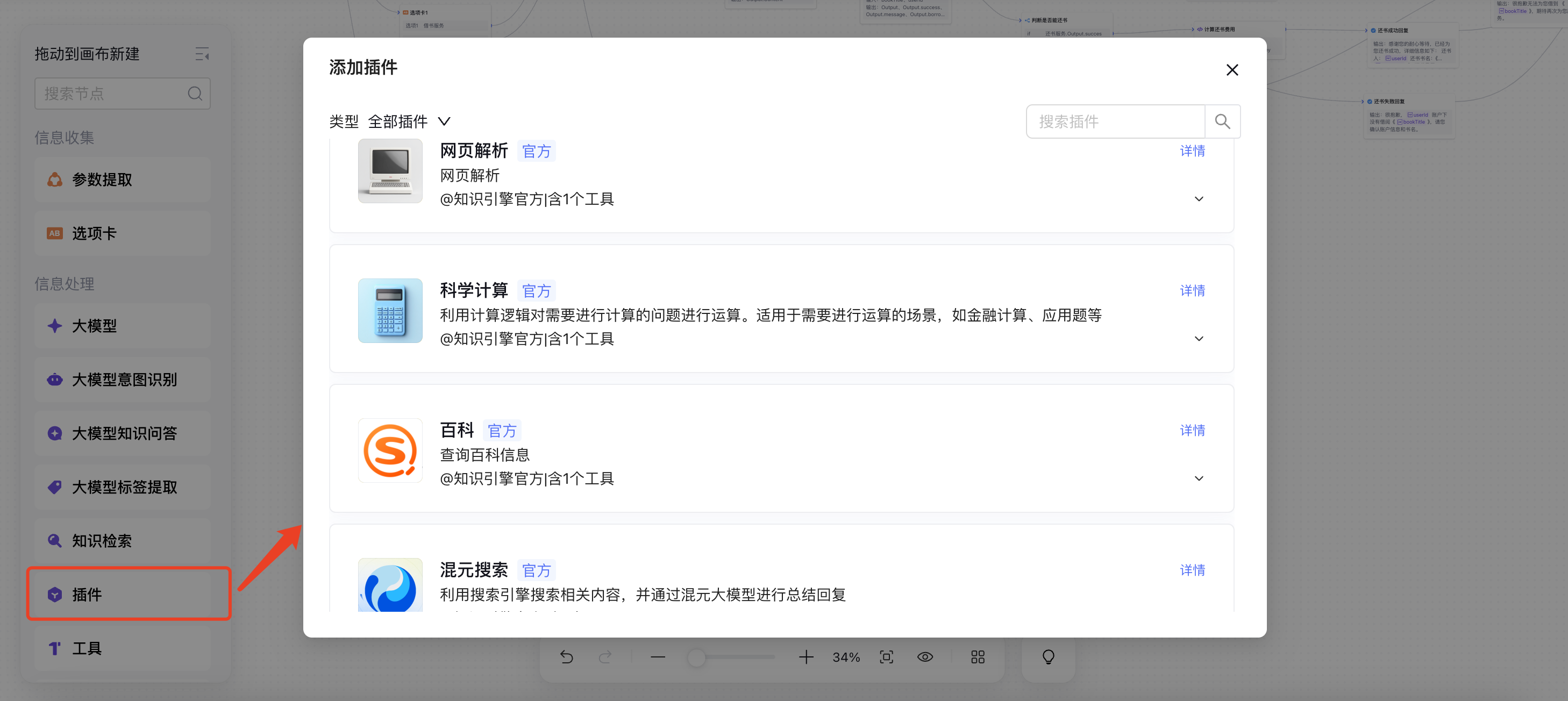在画布中新建插件节点时,系统自动弹出插件选择框,您可以在插件选择框中选择所需要的工具。选择后可在画布中使用该插件节点。