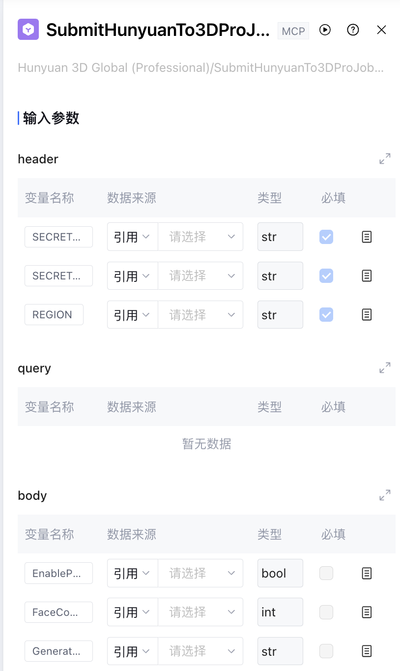 在配置基于 API 创建的插件时,输入变量分为header、query和body三个部分,其含义如下: