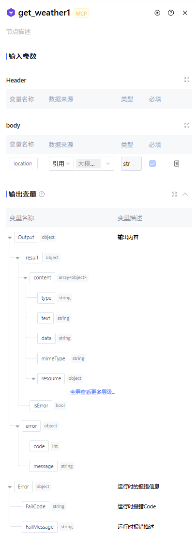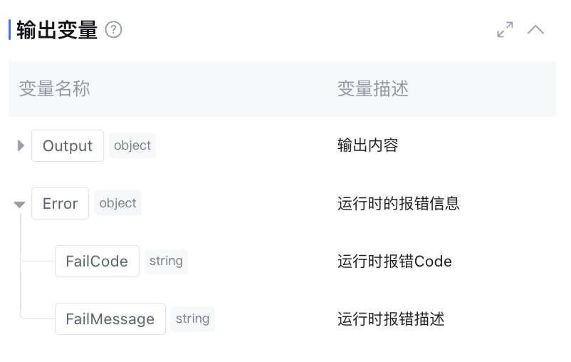经该节点处理后的输出变量,默认包含调用该工具所返回的结果,以及运行时报错信息 Error(数据类型为 object,正常运行时该字段为空)。不支持手动新增。