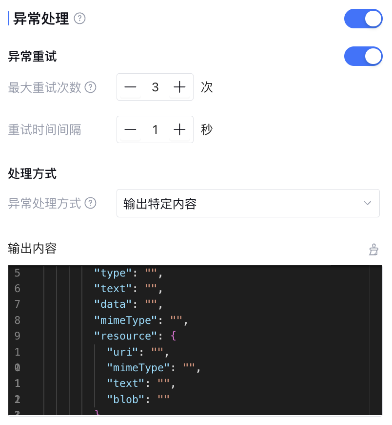 可手动开启异常处理(异常处理默认关闭),支持异常重试和异常处理方式的配置。配置内容如下: